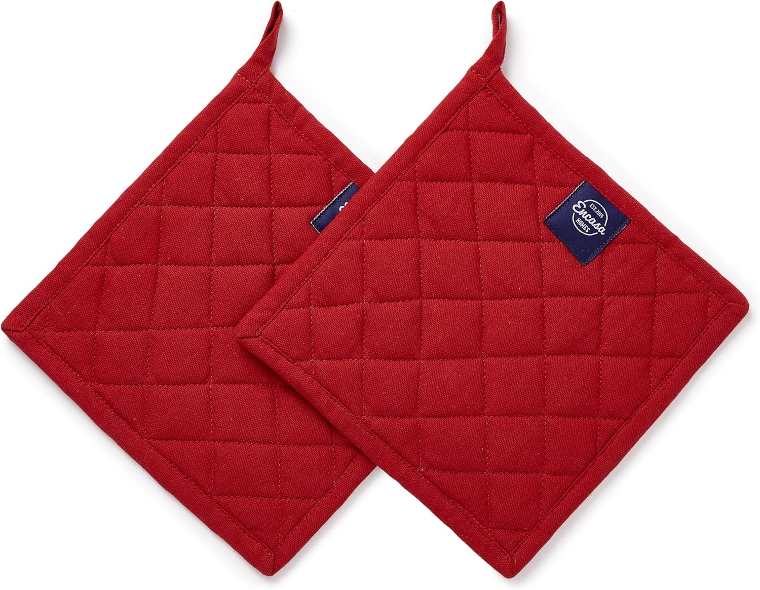 Encasa XO Heat Resistant Cotton Pot Holders with Hanging Loop - Set of 2 - Red - Multipurpose Quilted Everyday Hot Pad for Kitchen, Camping, BBQ & Microwave - 8x8 in