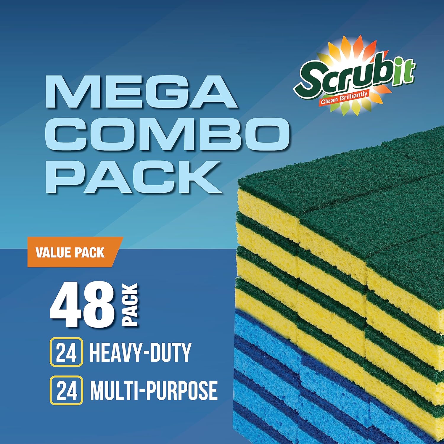 SCRUBIT 48 Pack Kitchen Sponges Dish Sponge for Washing Dishes, Kitchen & Bathroom – Blue & Yellow Dishwashing Sponges Along with A Thought Scrubber – Bulk Cleaning sponges Kitchen (Blue, Yellow)