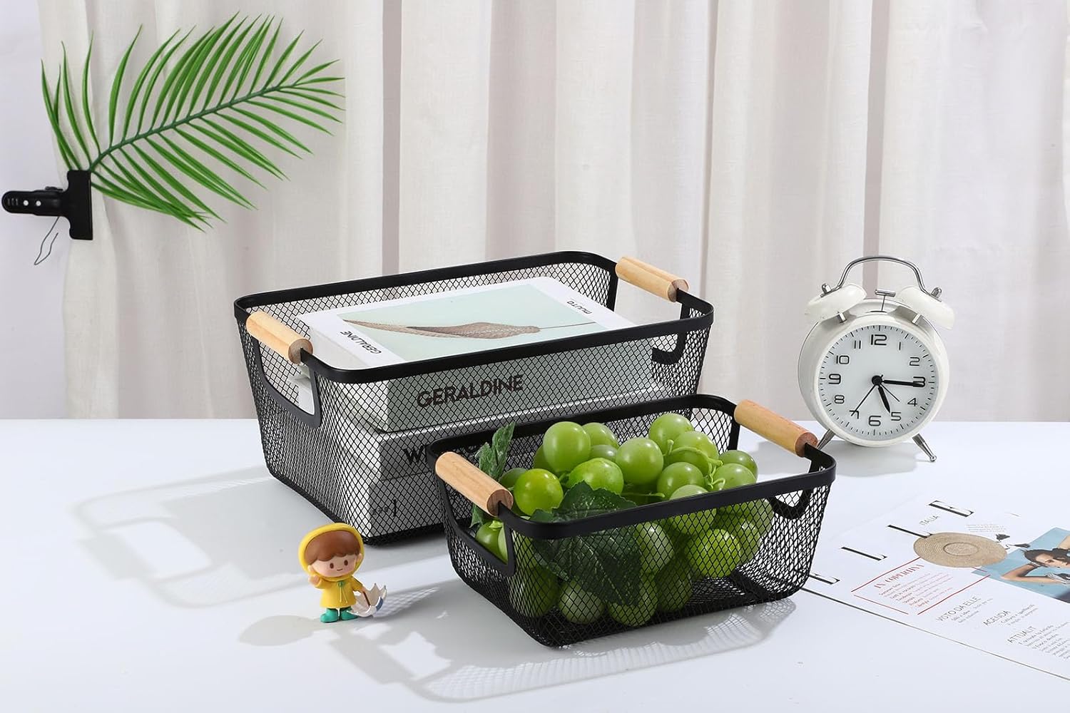 - Basket Dimensions: 9 x 6.7 x 3.94 inch / 23 x 17 x 10 cm (L x W x H). Material: metal + wooden. Include: 2pcs metal mesh wire steel basket.