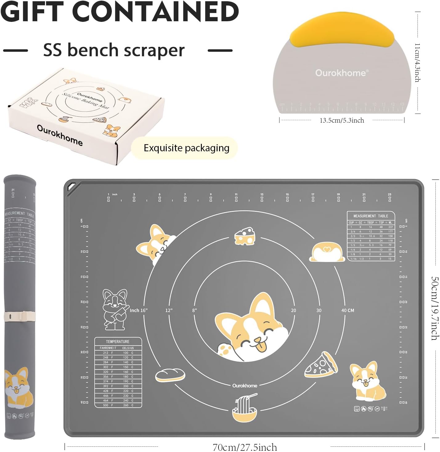 - Your go-to solution for hassle-free baking: Made from high-quality food-grade soft platinum silicone. Save your countertop from getting messy. Say goodbye to floor all over the flour. Included a bench scraper with scale and conversion table