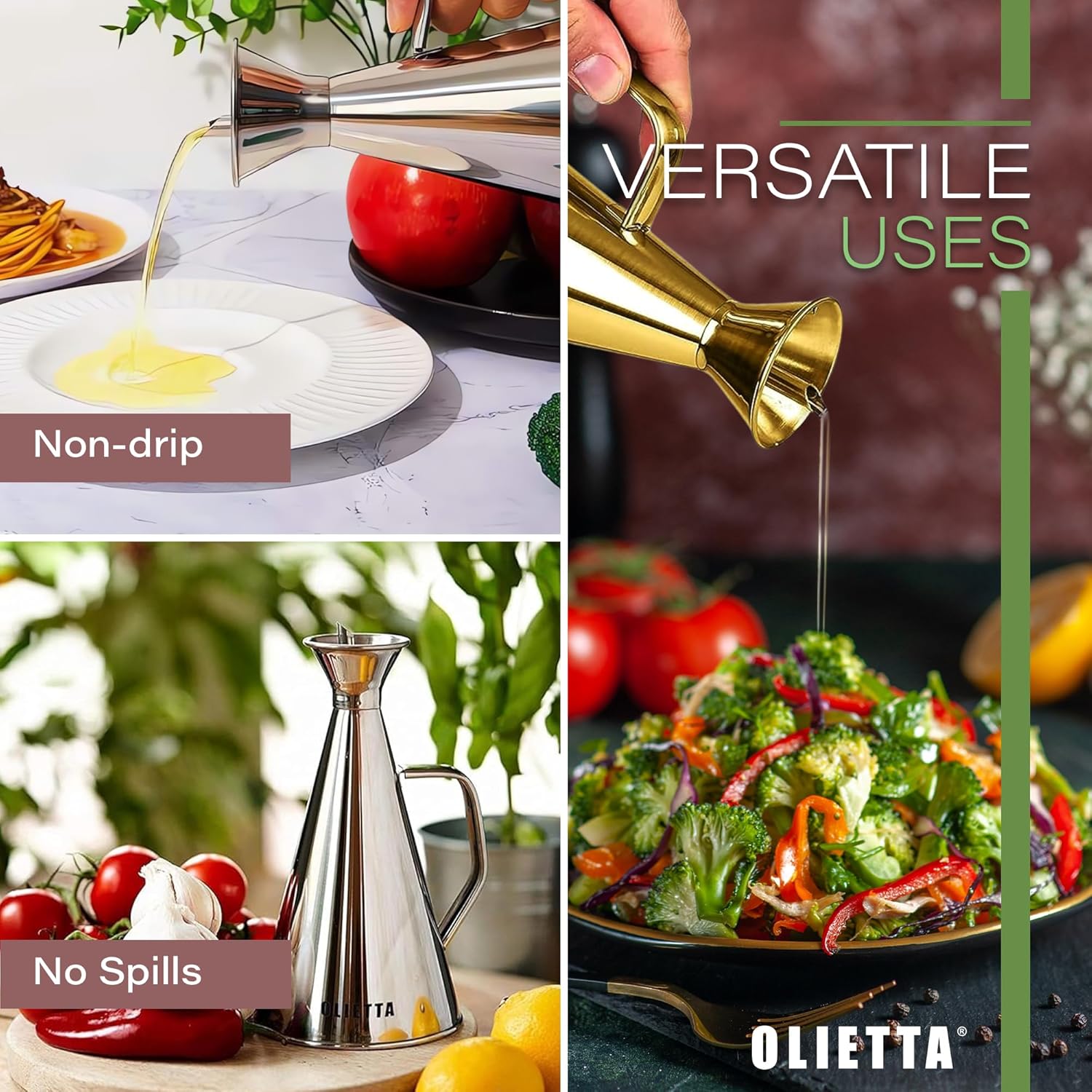 - SPILL-FREE PRECISION: No mess, no spills, non-drip. Say farewell to spills and drips! The Olietta stainless steel oil dispenser bottle ensures a clean experience every time. Tested for optimal pouring, its non-drip spout guarantees precise drizzling, ensuring you get just the right amount of oil with each pour. Make the Olietta olive oil bottle a staple in your kitchen. It's an essential addition you'll love.