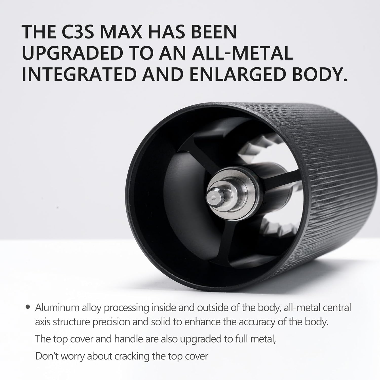 - [ C3 Max Pro Upgraded to C3S Max Full Metal Aluminum Body ] Crafted with an all-metal aluminum alloy body, the TIMEMORE C3S Max manual coffee grinder offers outstanding durability and longevity. This sturdy construction not only withstands frequent use but also protects the internal components from any potential damage. Additionally, the aluminum alloy body contributes to efficient heat dissipation during grinding sessions, preventing overheating that can compromise the delicate flavors of your coffee beans