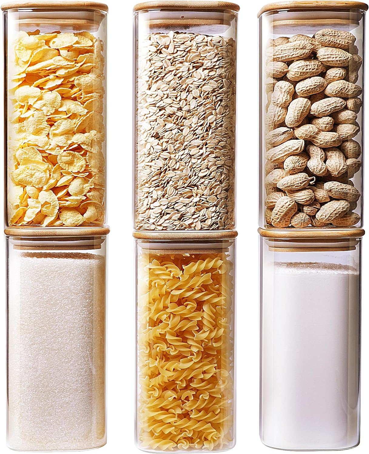 - 【 Large Capacity Glass Jars with Bamboo Lids Set of 6 】 Square Glass containers with lids set of 6, 6 x Large: 3.15 x 7.87 inch [about 30 floz], great for pasta, coffee, oats, cereal, flour, sugar, rice, candy, cookies, nuts, teas, etc. With 3.15" wide mouth design, you can easily refill with any type of foods.