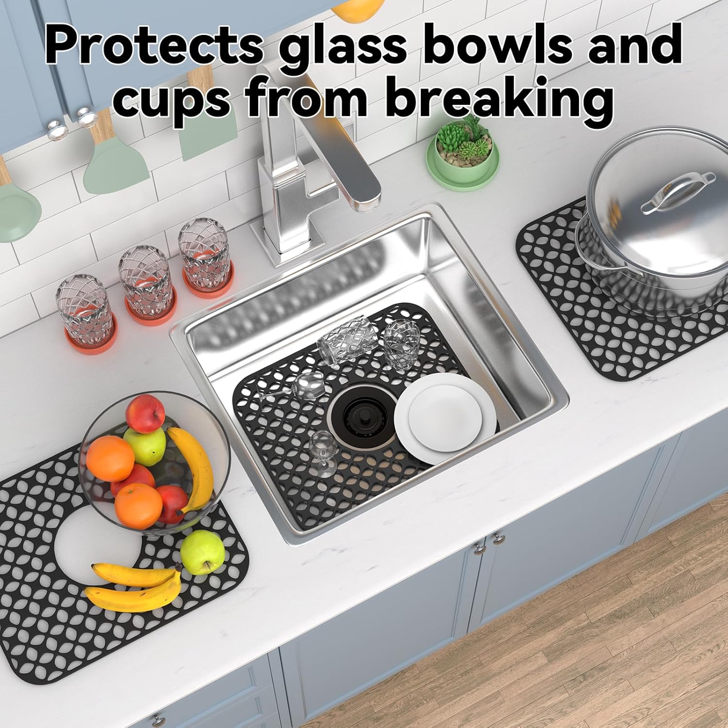 - Versatile Sink Mat: TOOVEM Silicone sink mats are bendable and foldable with good flexibility and will not deform or rust, sink protection mat won't scratch and damage the kitchen countertop or sink but also can protect glass, ceramic bowls and wine glasses from accidental breakage, providing safety for your kitchen utensils