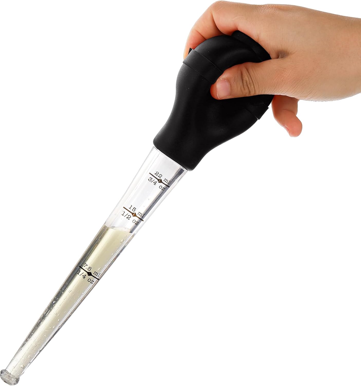 - The turkey baster for cooking are easy to use, you just need to squeeze and loose the bulb slightly, suck the juices or flavors you like and drizzle over the meat, embossed with capacity marks: ML/OZ on the clear stem that you can view the amount of the liquid in it clearly, easy to clean up by the equipped cleaning brush, convenient to cooking & baking!
