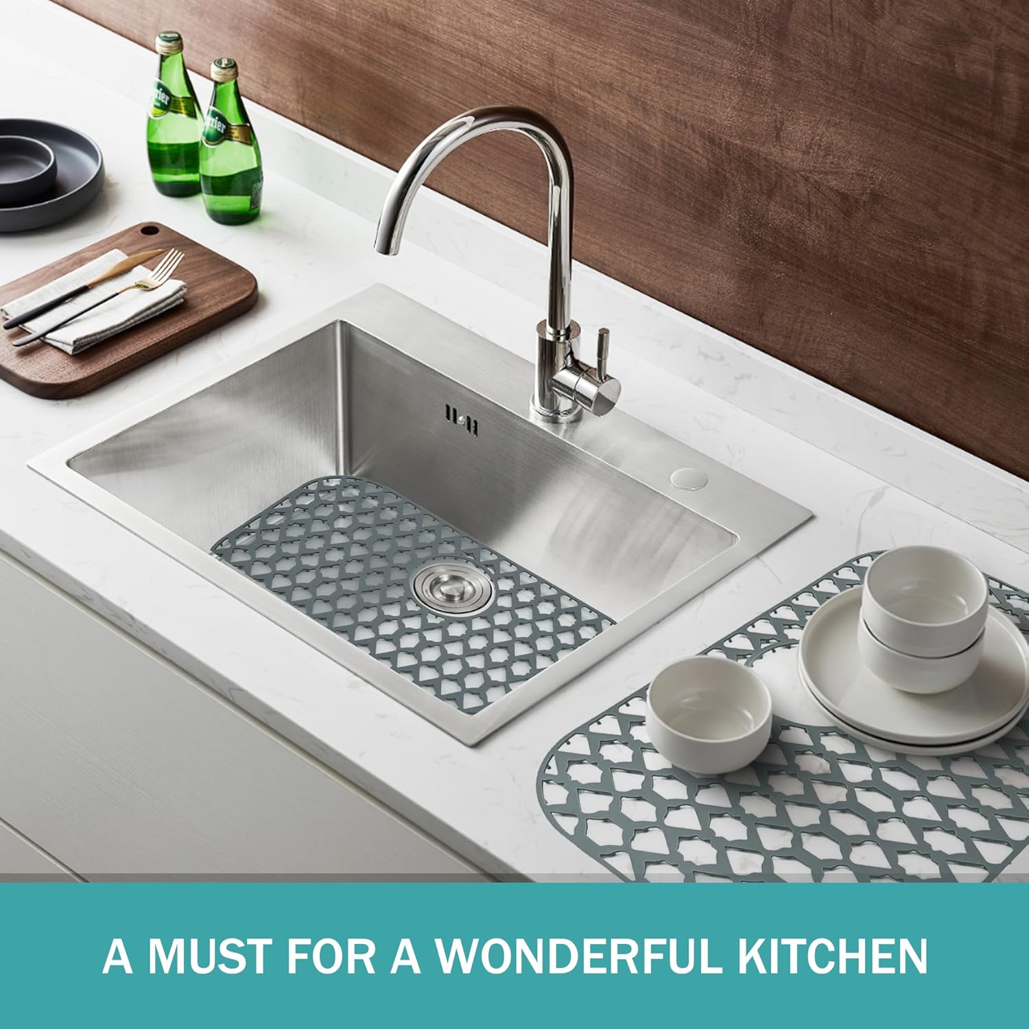 - Large Size & Flexiable - The size of our silicone sink mat is 22 ×13 inches. The silicone sink mat is flexiable that easy to fit the bottom of the kitchen sink. The silicone sink mat not only can be sink protectors for kitchen sink, but also can be a drying mat or dish mat. It is an essential item for the daily cleaning of the kitchen.