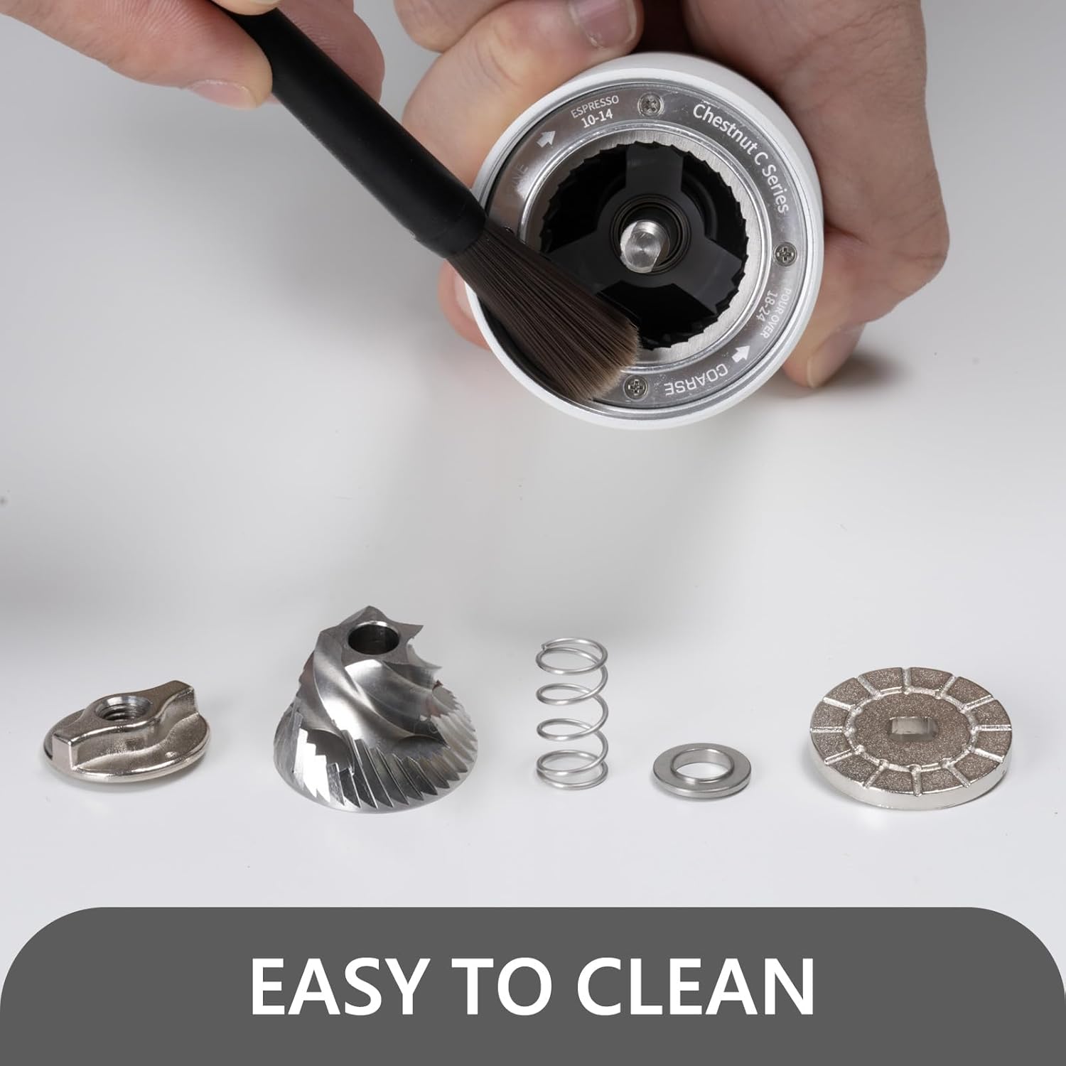 - 【Easy Clean & Carry】Coffee bean grinder does not use water to rinse, use the brush or air-blowing ball to complete the cleaning. In addition, the portable and compact size makes it easy to carry