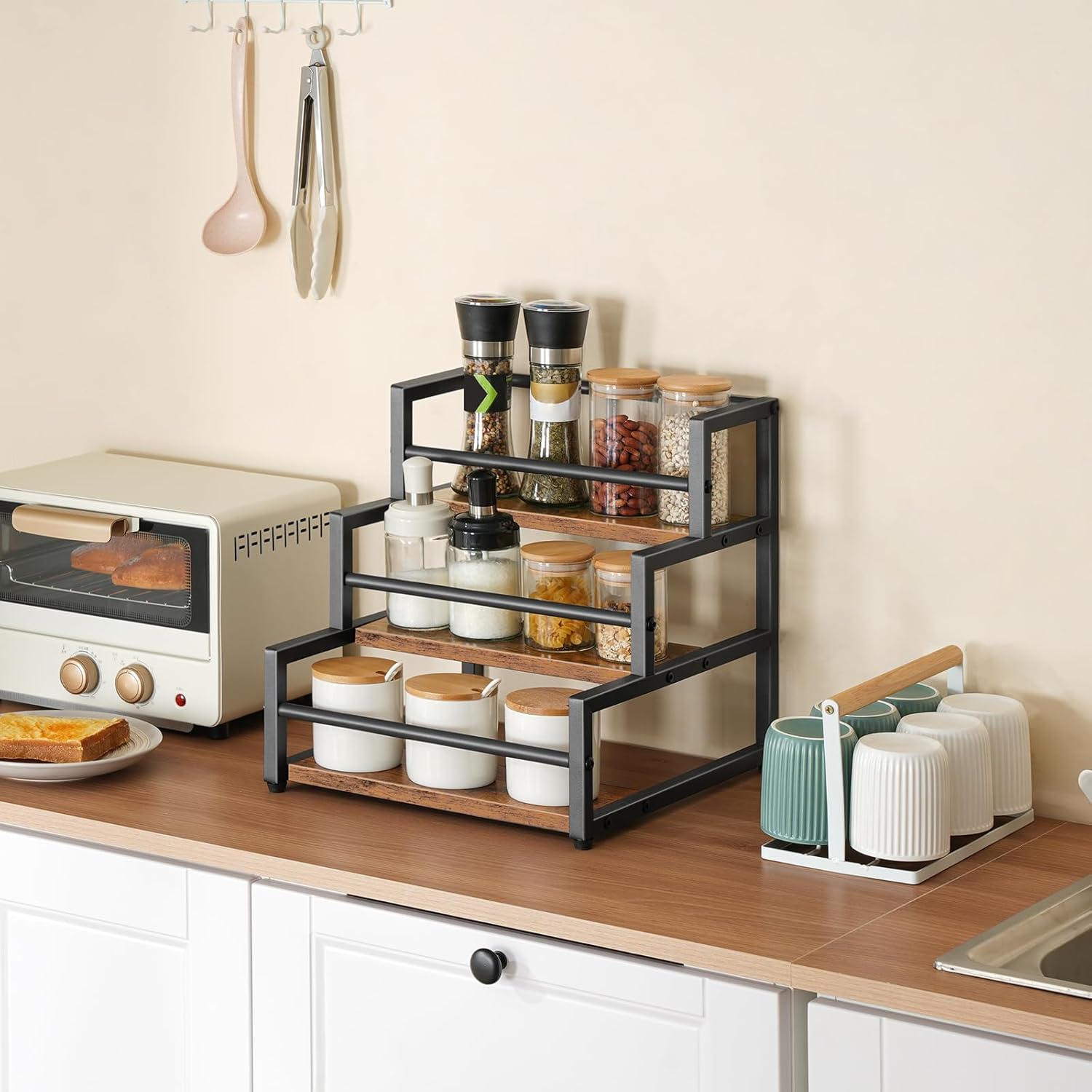 - Excellent Design: The wine rack is ideal for countertop or tabletop storage with its stepped design adding visual appeal to the countertops while keeping items within easy reach. You can use the syrup pump easily due to the right height of each shelf