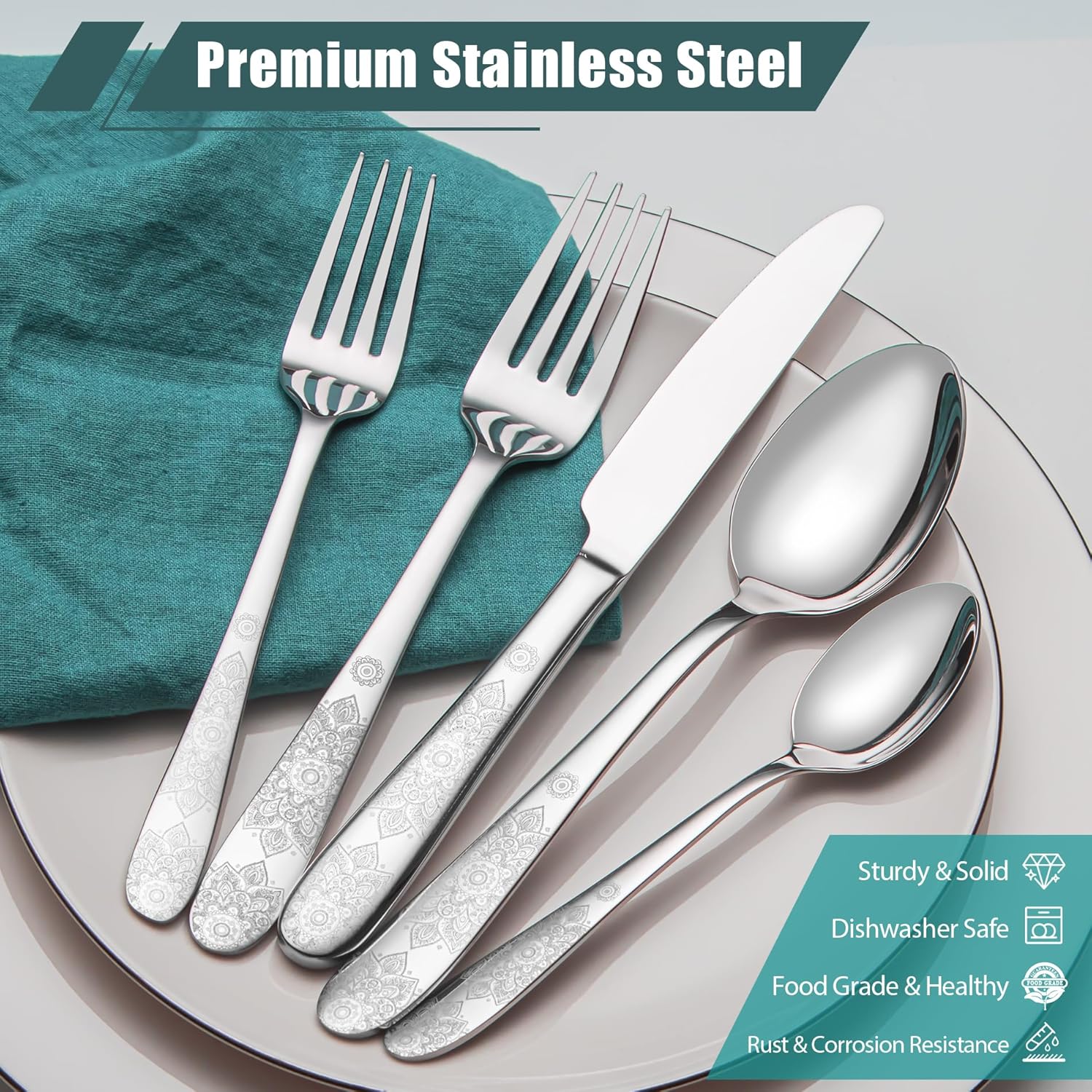 - 【Unique Silverware Set with Beautiful Pattern Handle】Our flatware set for 8 is designed with beautiful laser prints of flowers, unique styles make your dining table special, standing out from the ordinary tableware, and unique silver finish pattern design brings modern and stylish to the silverware sets impresses your family and friends when they come round for dinner
