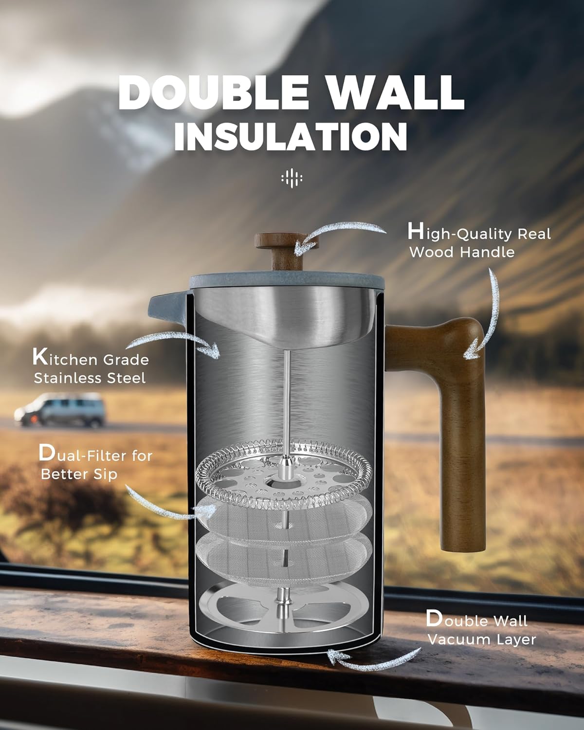 POLIVIAR French Press Coffee Maker, 34 Ounce Coffee Press with Real Wood Handle, Double Wall Insulation & Dual-Filter Screen, Food Grade Stainless Steel for Good Coffee and Tea JX2023-FPLU