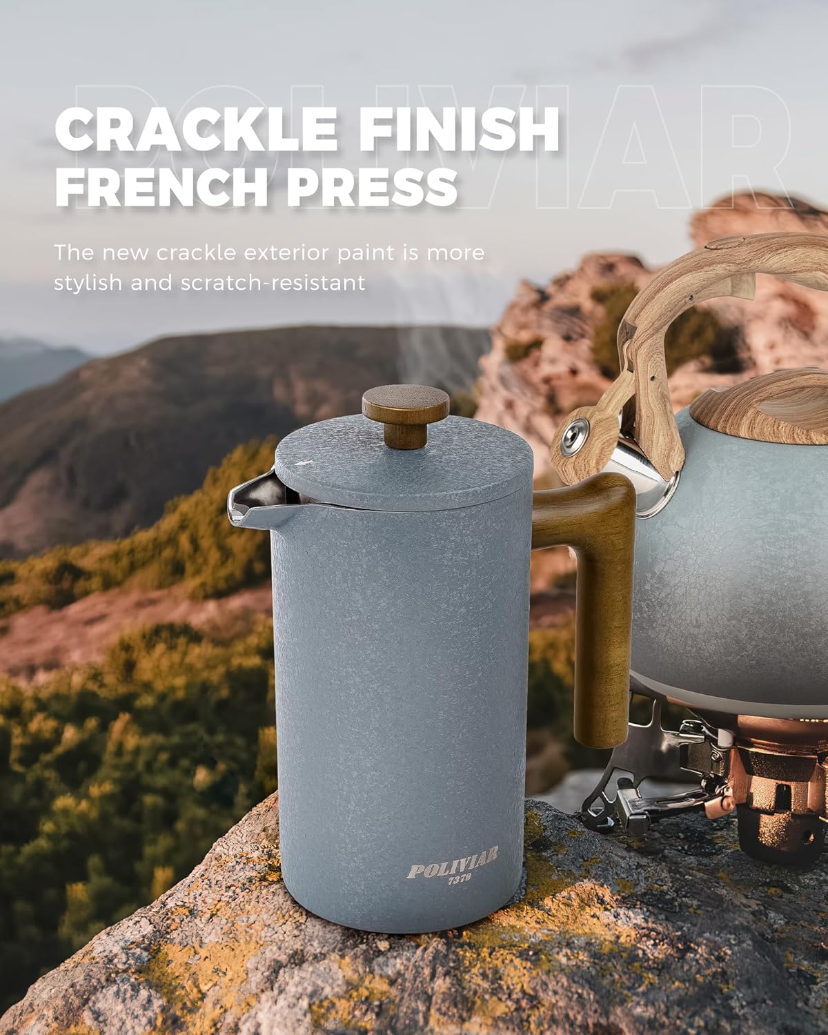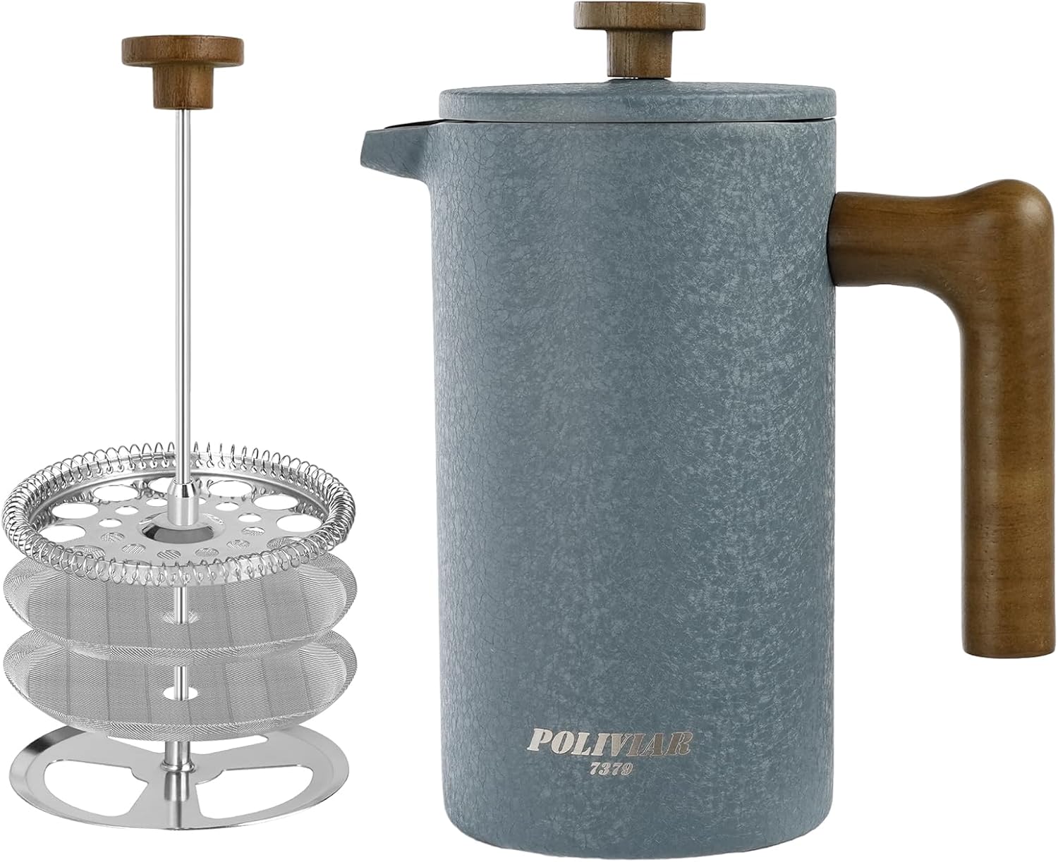 - LOOKING FOR COFFEE PRESS FOR MATCHING UP YOUR KITCHEN? We, the POLIVIAR french press coffee maker will be your smart choice. While the coffee pot is made from food grade stainless steel with stylish long-lasting coating, It is easily to match up your kitchenwares and your kitchen's theme. Also, the ergonomic handle with real wood will maximize the fantastic time of grounds you loved.