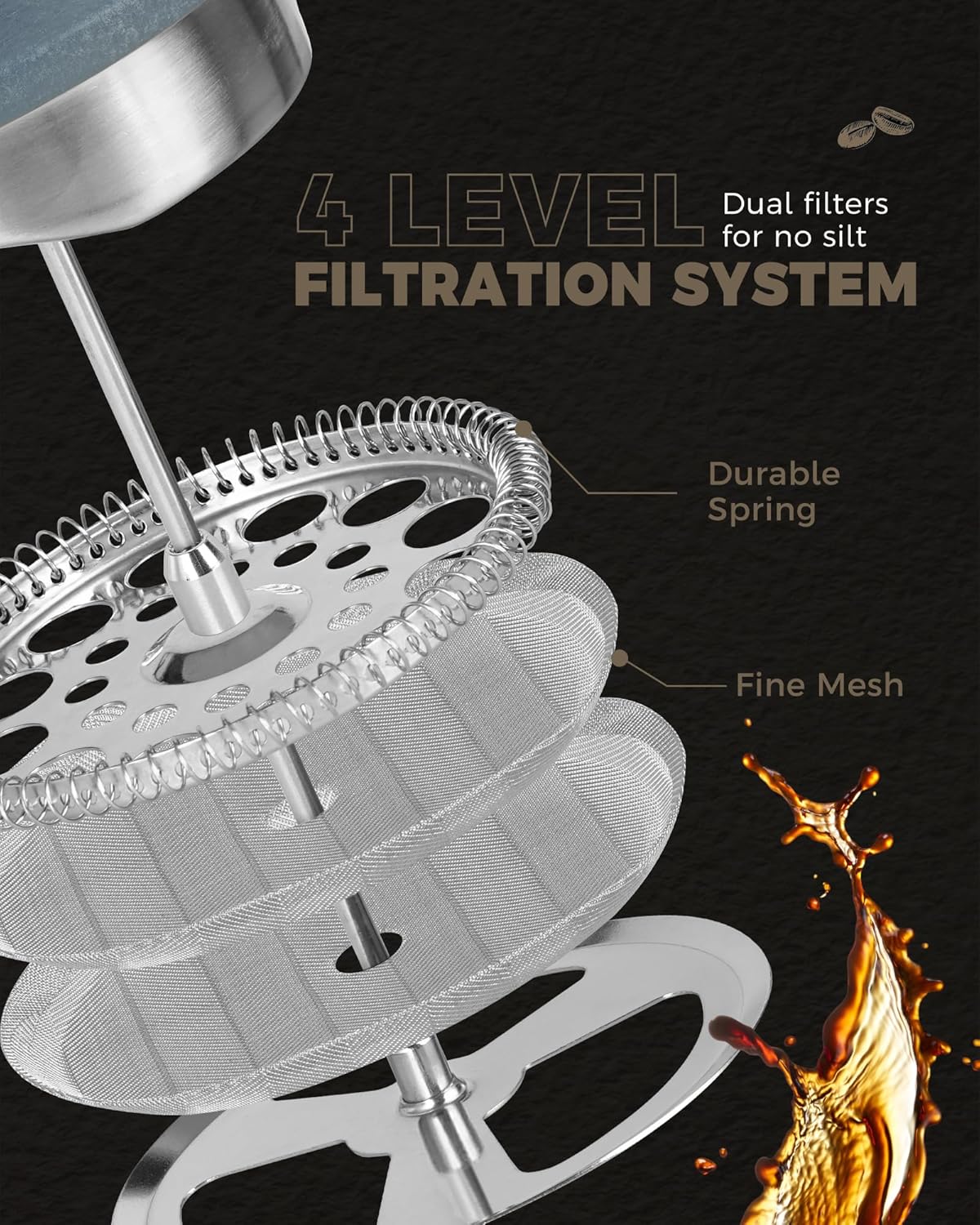 - A GOOD COFFEE PERCOLATOR WILL FILTER OUT THE SEDIMENT BUT NOT THE TASTE AND AROMATIC COFFEE OILS.This press maker is designed with dual-filter screen and composed of a sandwich of steel mesh held in place to increase the smoothness of the brew and keep the orginal taste of grounds.