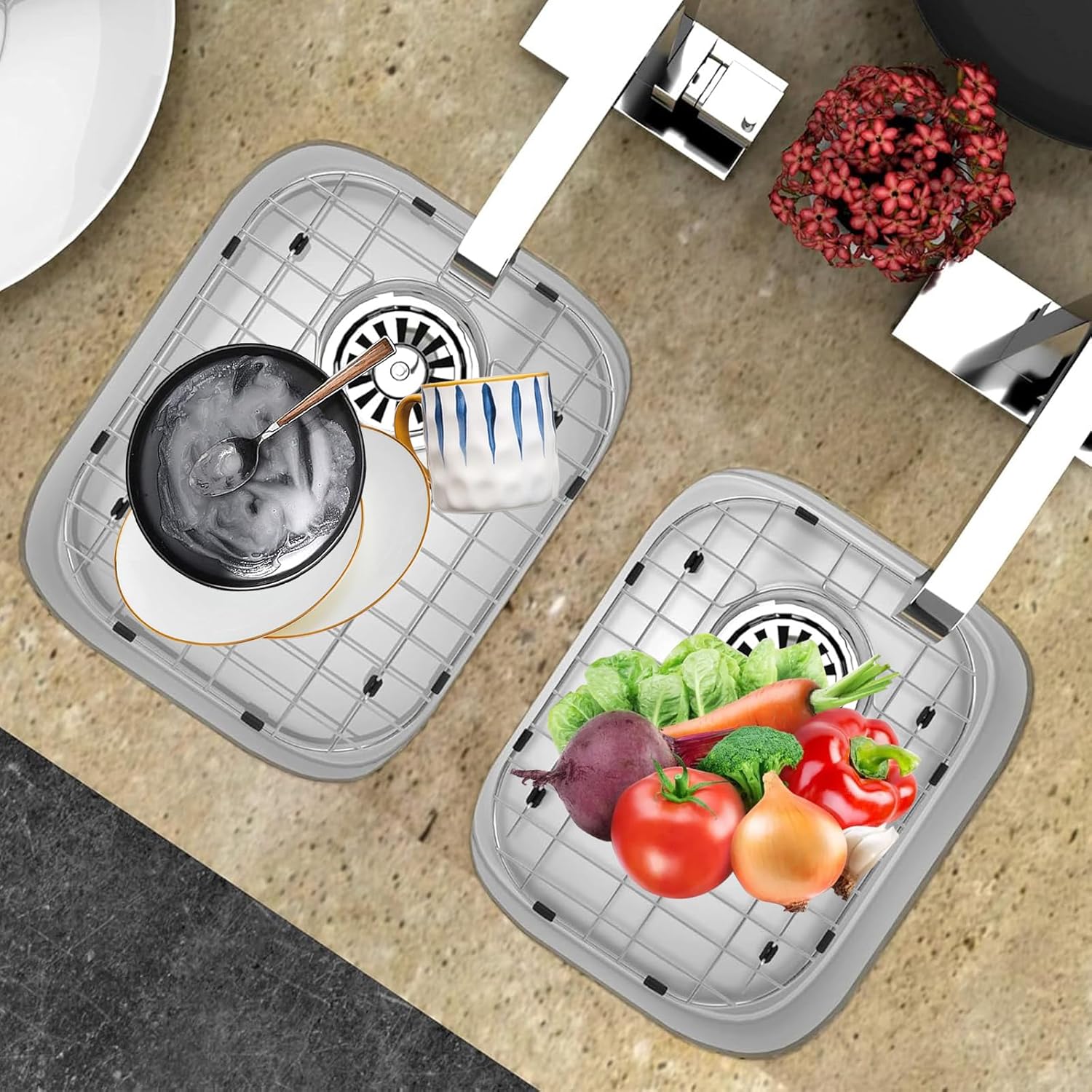 - Multifunctional Sink Bottom Grid Rack - Orgneas sink rack can protect your kitchen sink while meet your different need. They are perfect in-sink cooling rack, defrost grid and drying rack to dry dishes, tablewares, vegetables, fruits, glassware, utensils and pans.