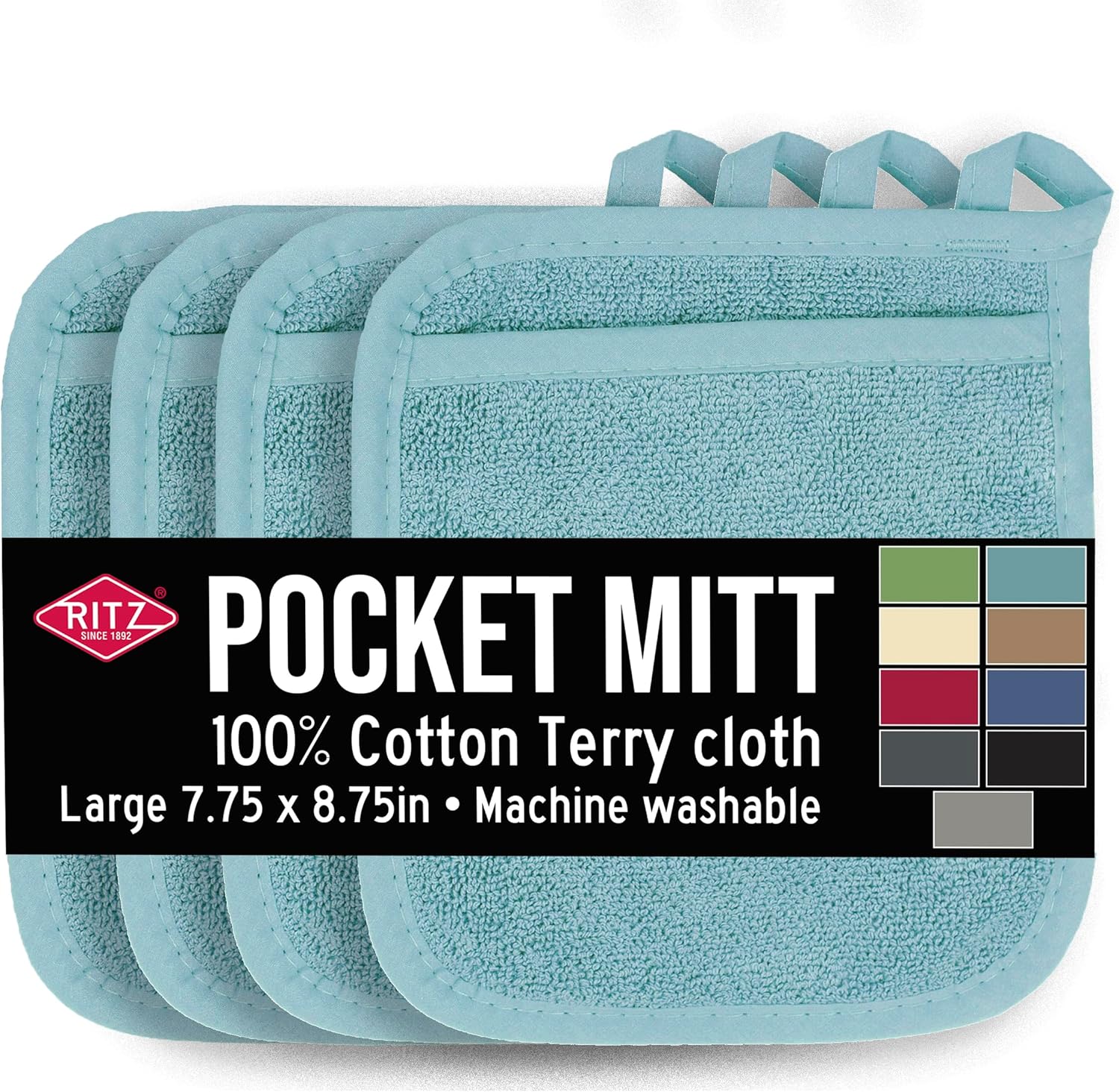 RITZ Terry Pocket Mitt & Hot Pad: Unparalleled Heat Resistant, Durable 100% Cotton,Ergonomically Designed for Optimal Grip, Easy-Care Machine Washable 4-Pack, Dew