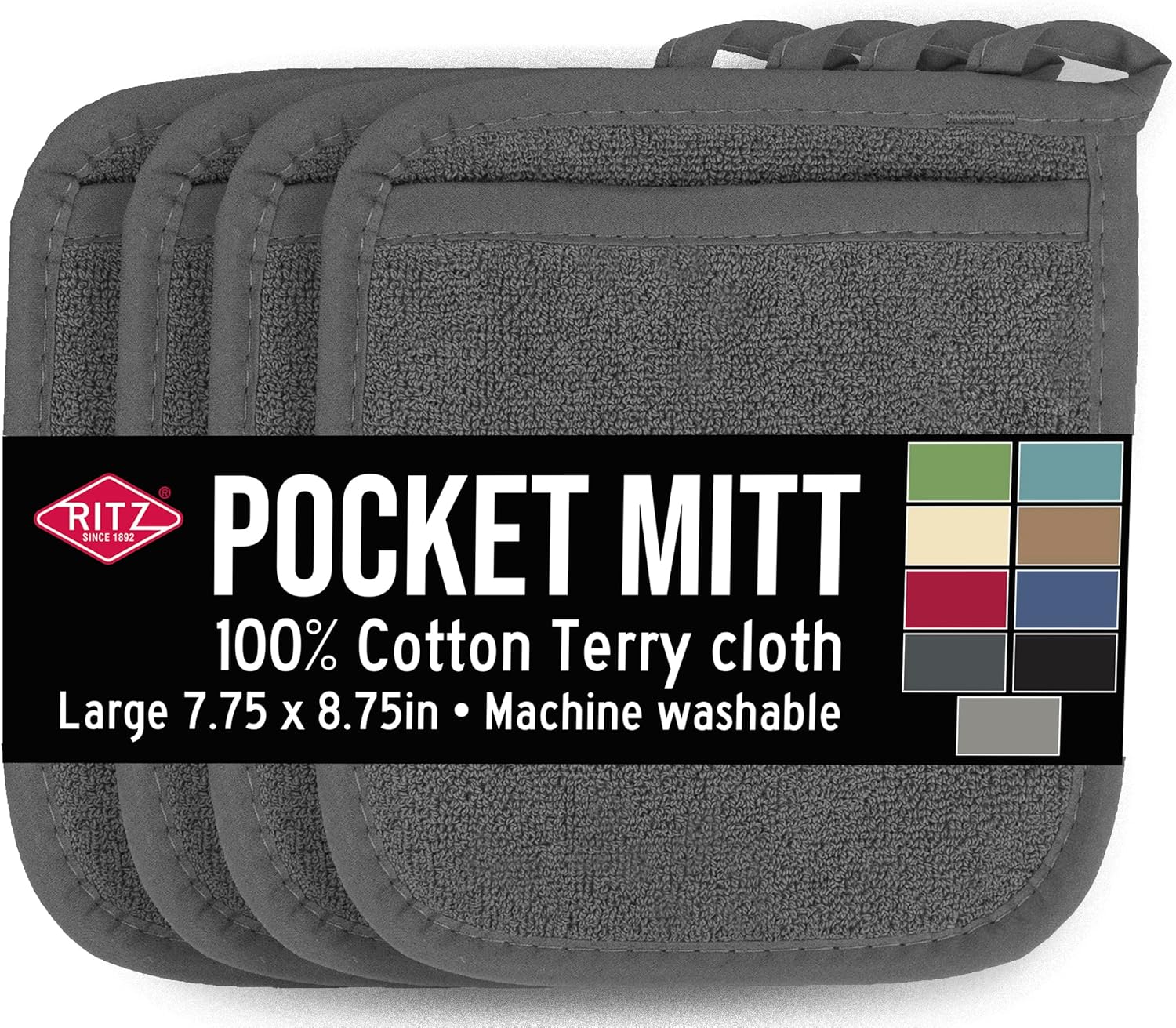 RITZ Terry Pocket Mitt & Hot Pad: Unparalleled Heat Resistant, Durable 100% Cotton – Ergonomically Designed for Optimal Grip – Easy-Care Machine Washable – 4-Pack, Graphite