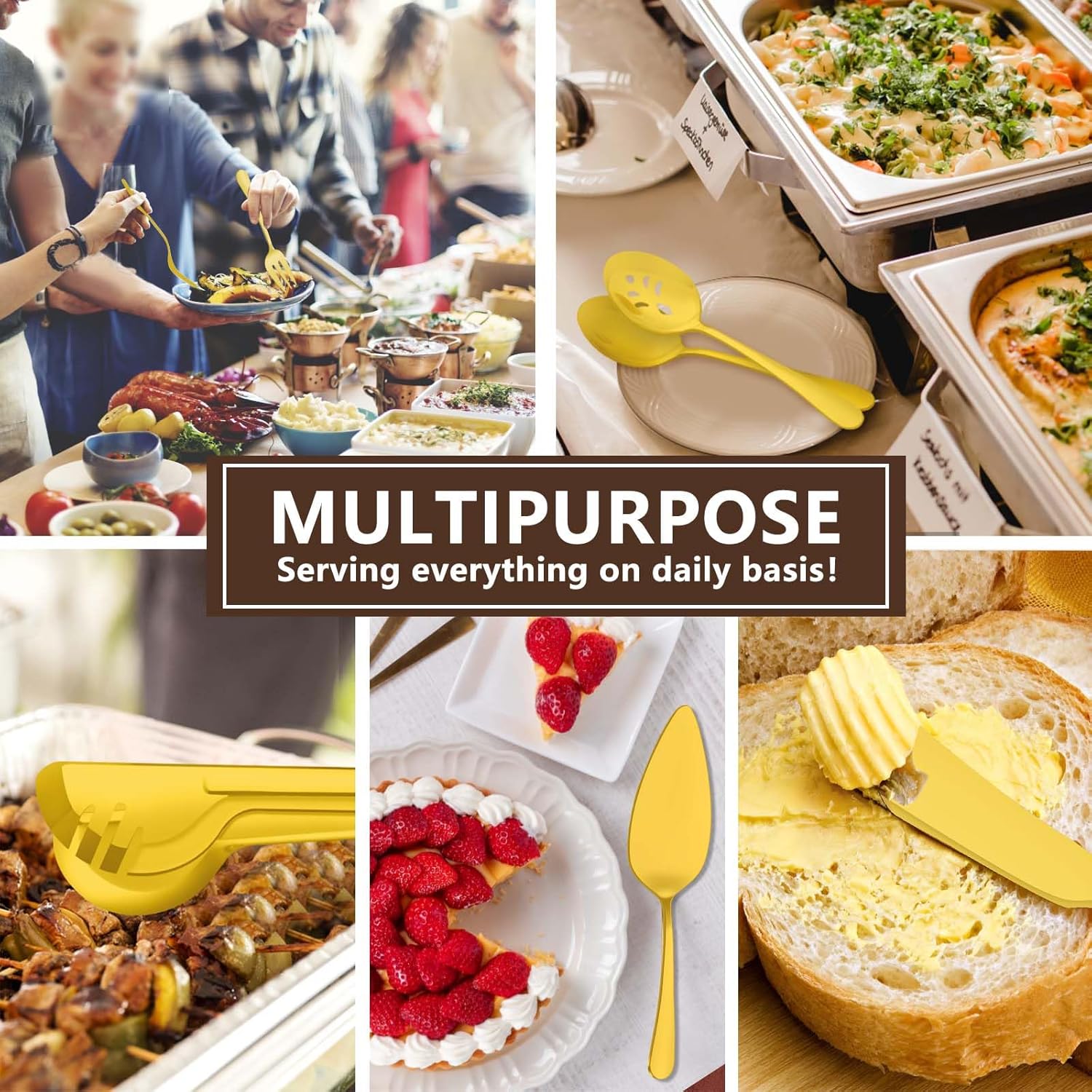 - ăNice Buffet Serving SetăThese metal gold serving utensils will be very suitable for serving food, distributing solid food, picking up food, filtering food, spreading butter and jam. The classic and elegant design makes this serving utensil set perfect for most dining occasions, providing you with a cozy and enjoyable dining atmosphere