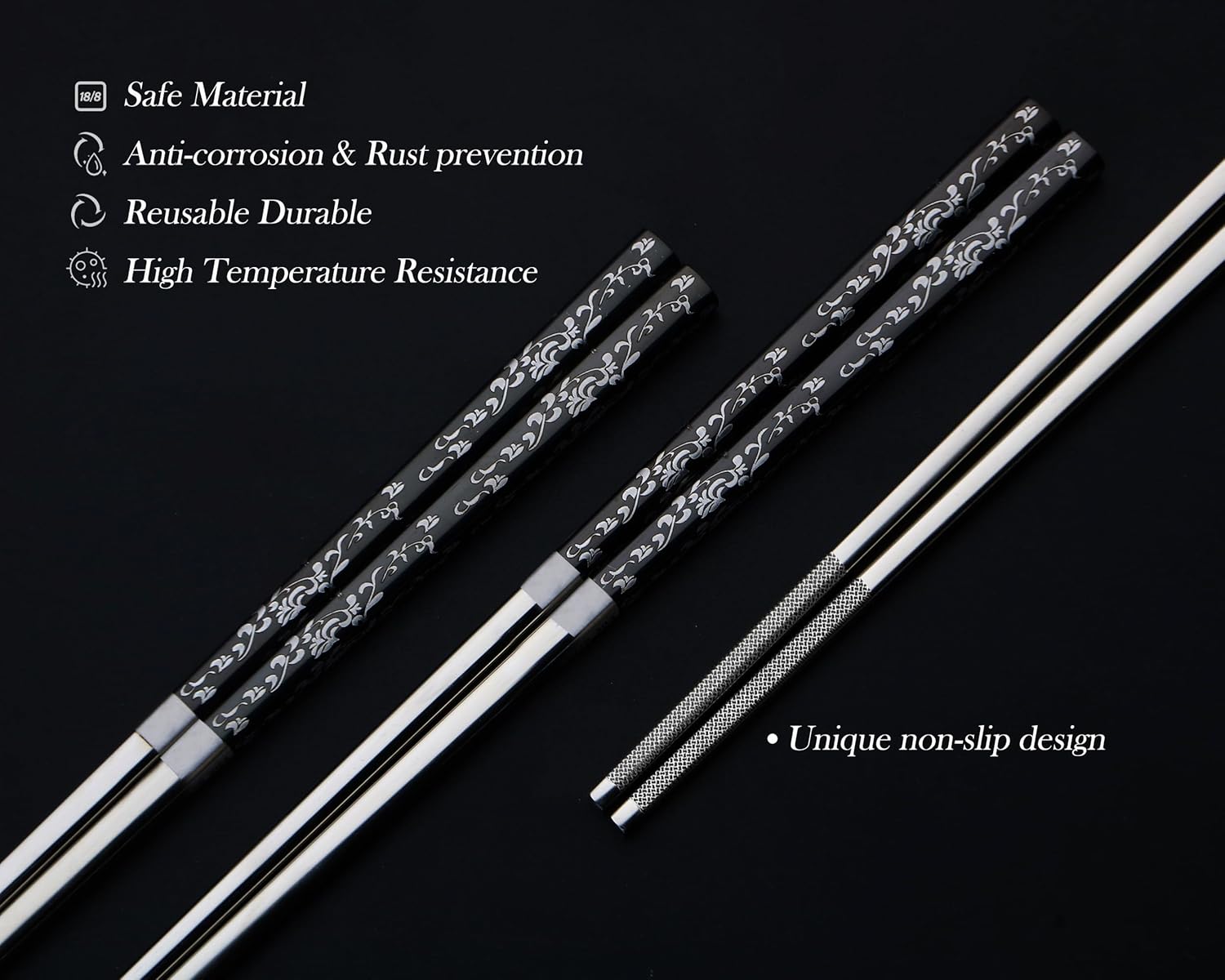 - ✿ 【Silver Black with Unique Laser Pattern】: The metal chopsticks are laser with Non-slipped pattern. Not easy fading after long time use. Each pair stainless steel chopsticks has pattern. The etching on the metal chopsticks reduces the slippery feeling.