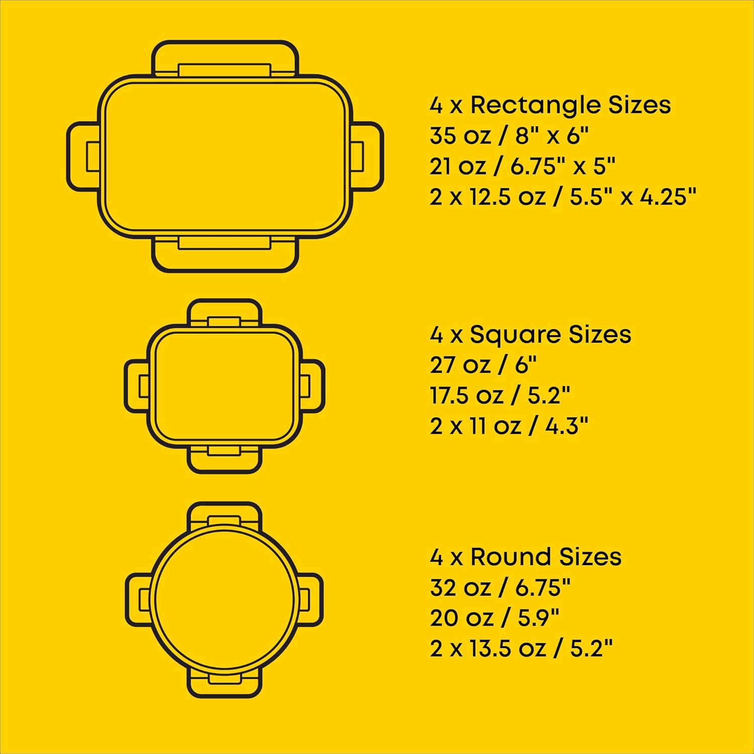- 12 SIZES FOR EVERY NEED: Our airtight food storage containers with lids set includes 4 rectangle containers 35oz (8x6in), 21oz (6.75x5in), 12oz (two 4.2x5.5in). 4 square containers 27oz (6in), 17.5oz (5.2in), 11oz (two 4.3in). 4 round containers 32oz (6.75in). 21oz (5.9in), 13.5oz (two 5.2in). Height ranges from 1.75-2.3 inches.