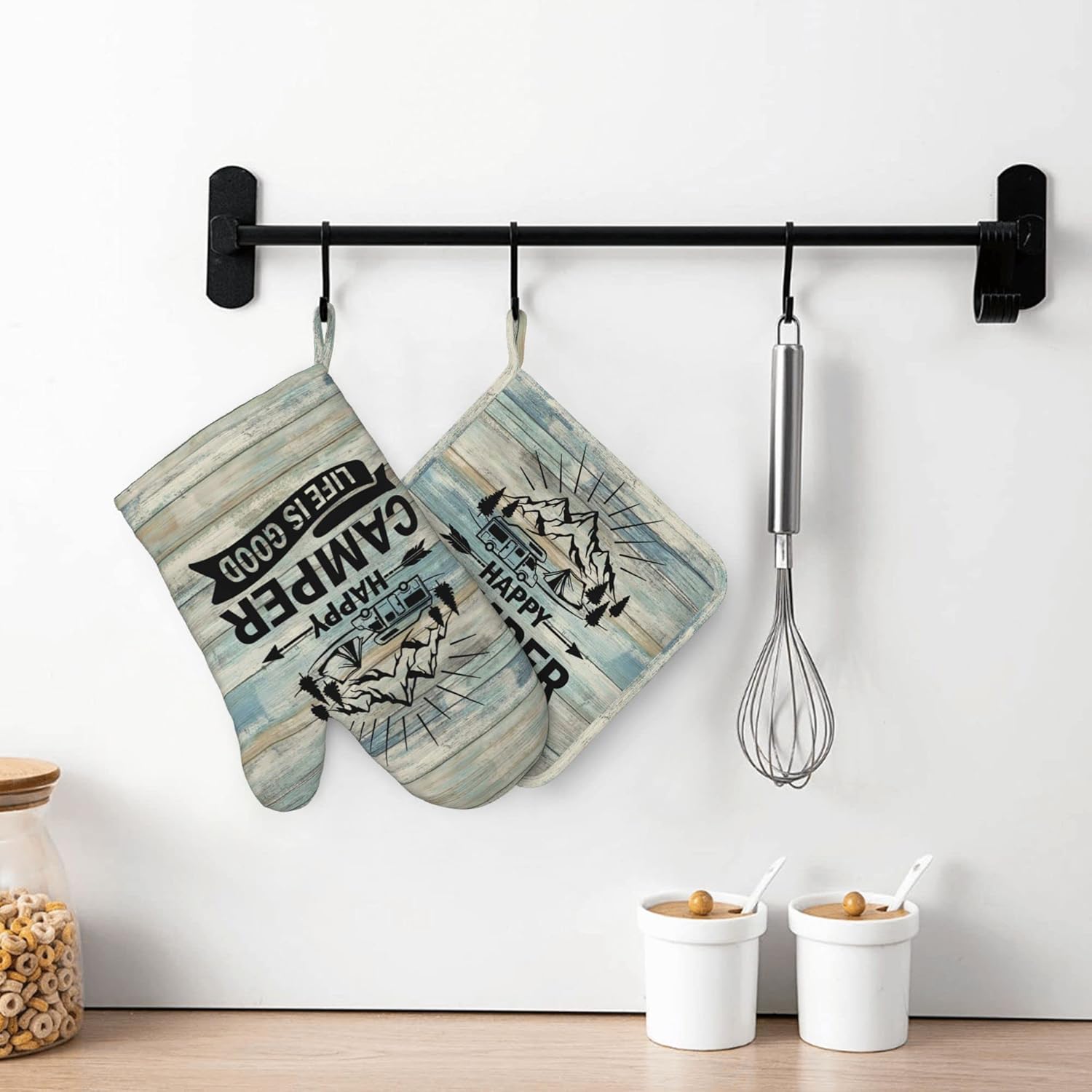 Happy Camper Oven Mitts and Pot Holders Sets of 4,Resistant Hot Pads with Silicone Non-Slip BBQ Gloves for Kitchen,Cooking,Baking,Grilling