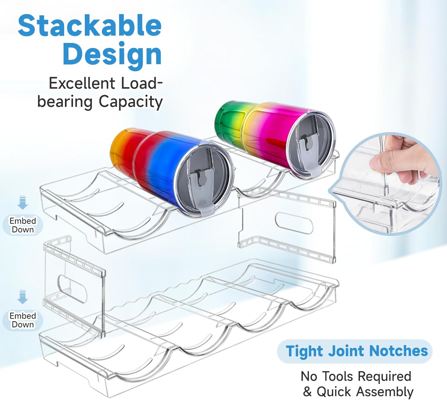 - HIGH-QUALITY MATERIALS: This water bottle organizer is made of high-quality, shatterproof, and transparent PET material. It has a strong load-bearing capacity, ensuring stability and preventing wobbling. This shelf can be used to store champagne, water bottles, soda, drinks, and more, making it much easier to access the bottle you want without having to move others in the cabinet.