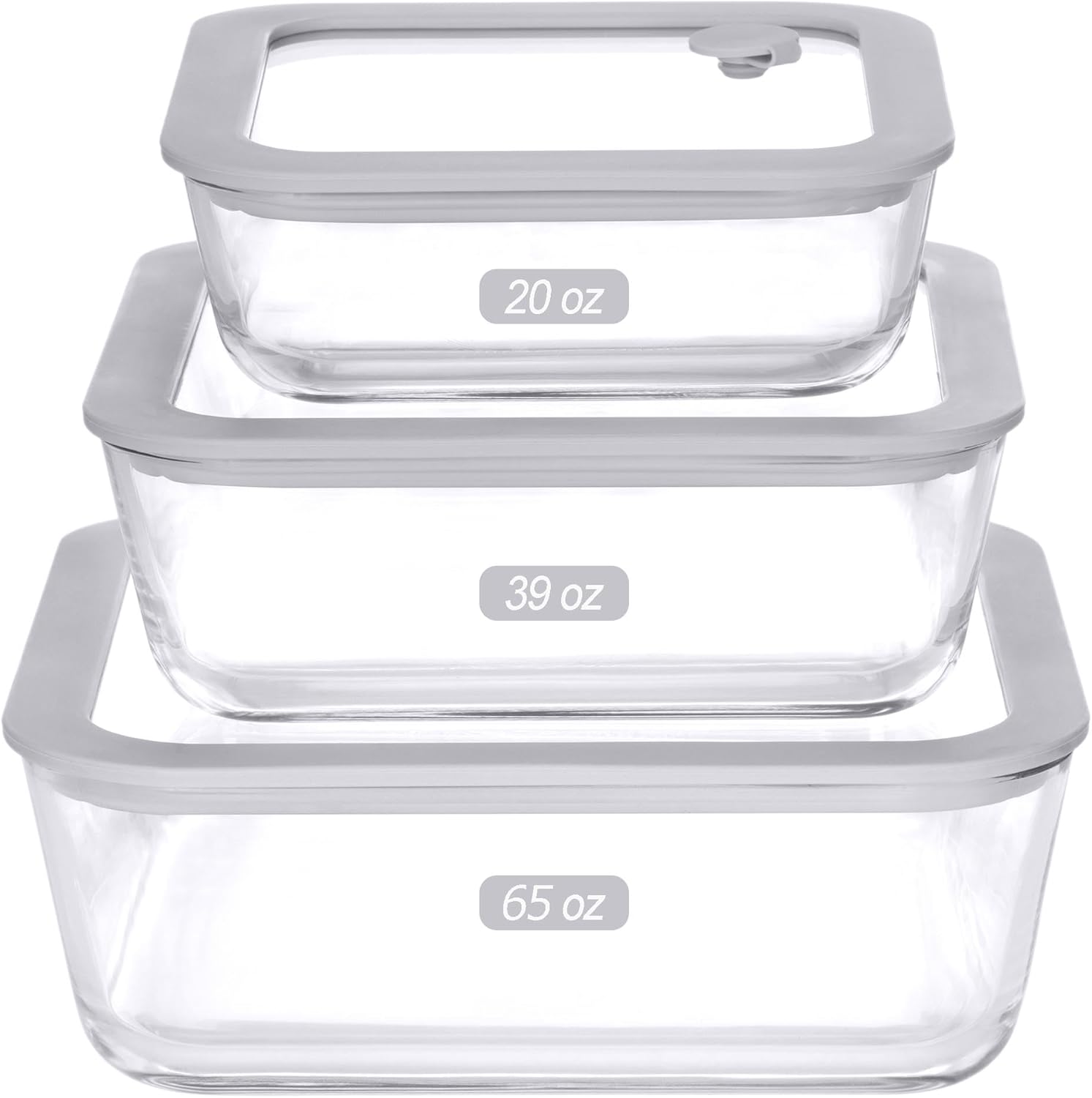 - ✅3 SETS OF LARGE SET: Each set comes with the glass containers and grey silicone framed glass lids. Square Shape Size : 65oz, 39oz, 20oz, (8.3x8.3x2.6, 7.15x7.15x2.2, 6x6x1.75)