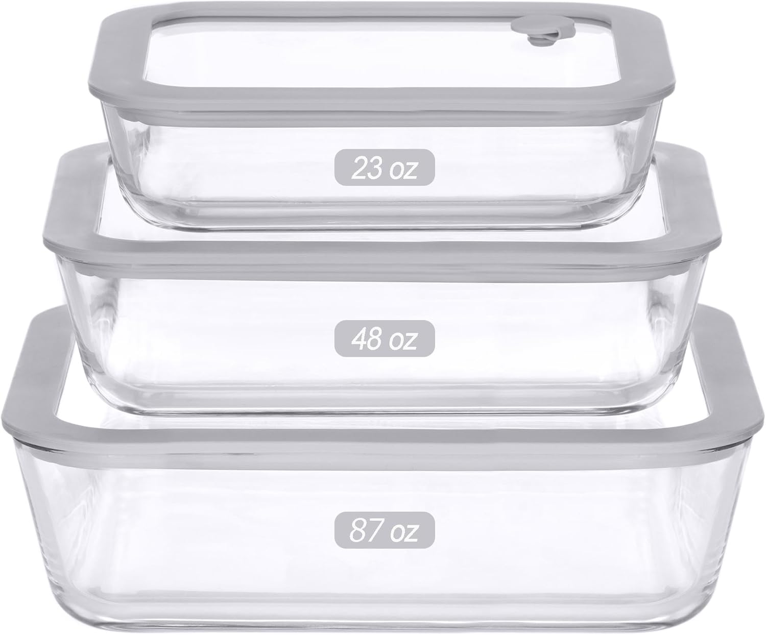 - ✅3 SETS OF EXTRA LARGE SET: Each set comes with the glass containers and grey silicone framed glass lids. Rectangle Shape Size : 87oz, 48oz, 23oz, (8x10x3.15, 7x9x2.5, 6x7.75x2)