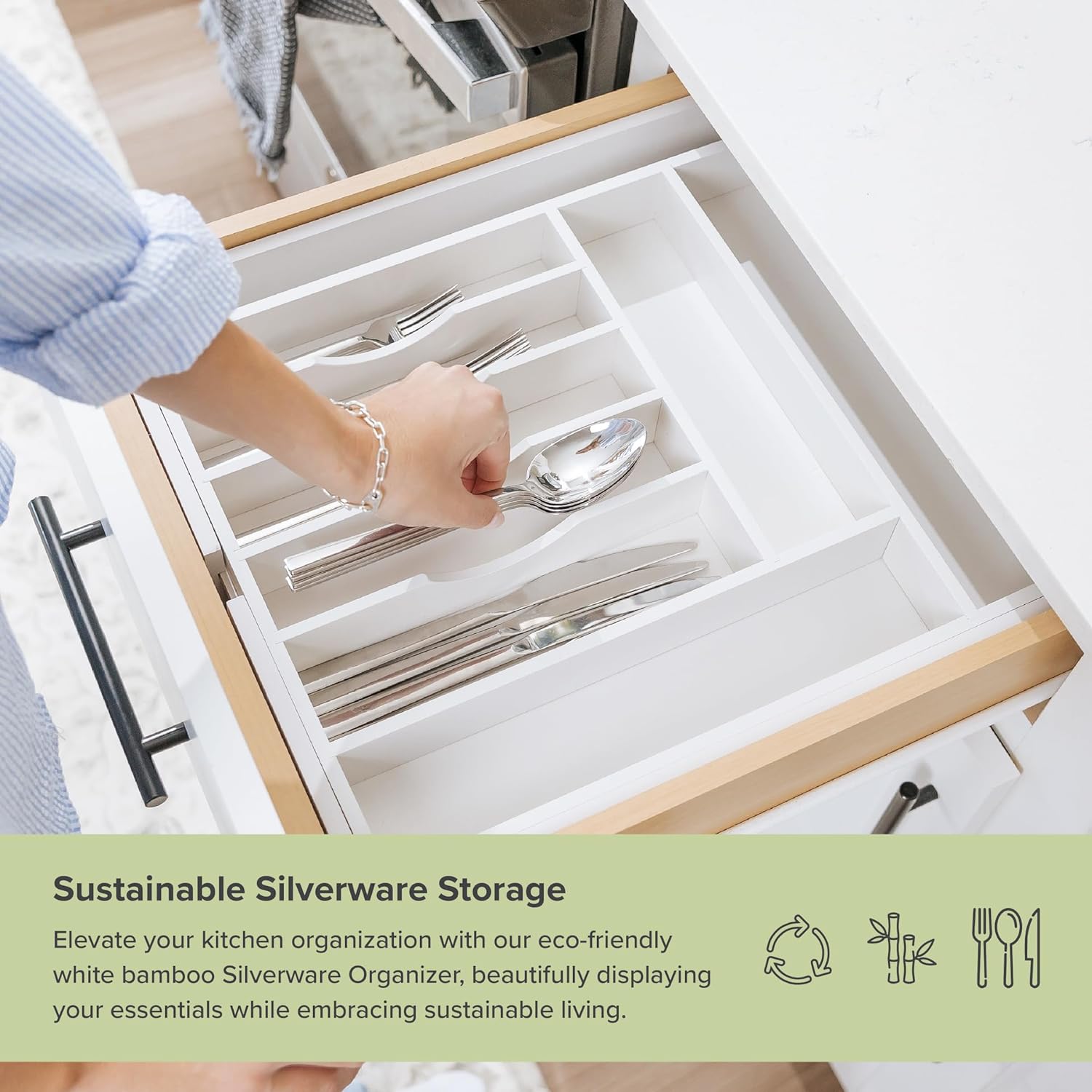 - MAXIMIZE YOUR DRAWERβS STORAGE CAPACITY: This 10-compartment (8 fixed + 2 adjustable) white organizer measures 17.4β long x 2.7β tall and expands from 14.5β to 25β wide (and any width in between). Most other bamboo organizers expand to 22β wide and are only 2β tall. Itβs amazing how much storage capacity an extra 0.7β in height adds when filling your organizer full of flatware and utensils!