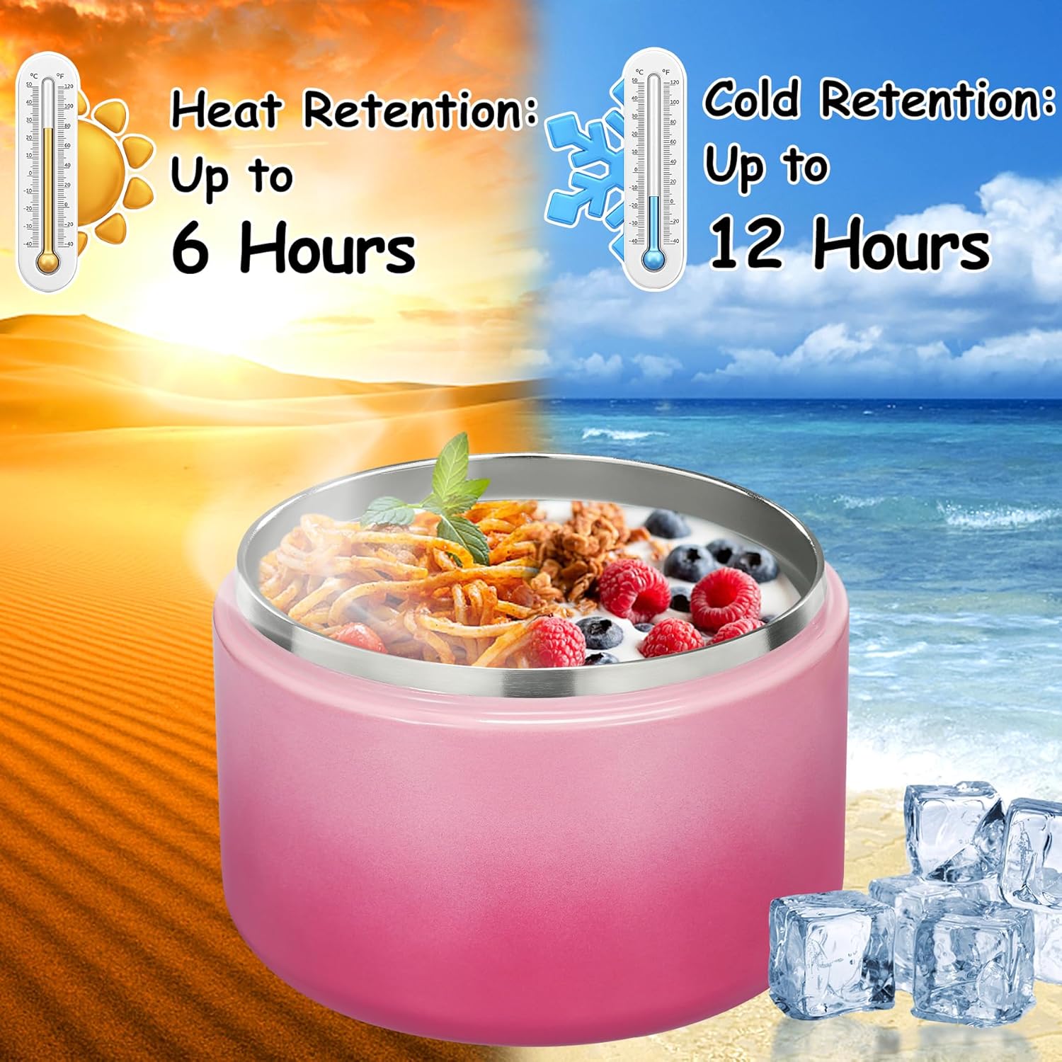 - Use Tips and Notes: In order to keep food hot or cold for a longer time, we recommend preheating/precooling with hot water/ice water for 5~10 minutes before putting food or soup into the food jar, and then put the food in. Note that when you disassemble the cover for cleaning and then reinstall it, be sure to lift the top of the cover before installing it. Otherwise, it will not be firm!!!