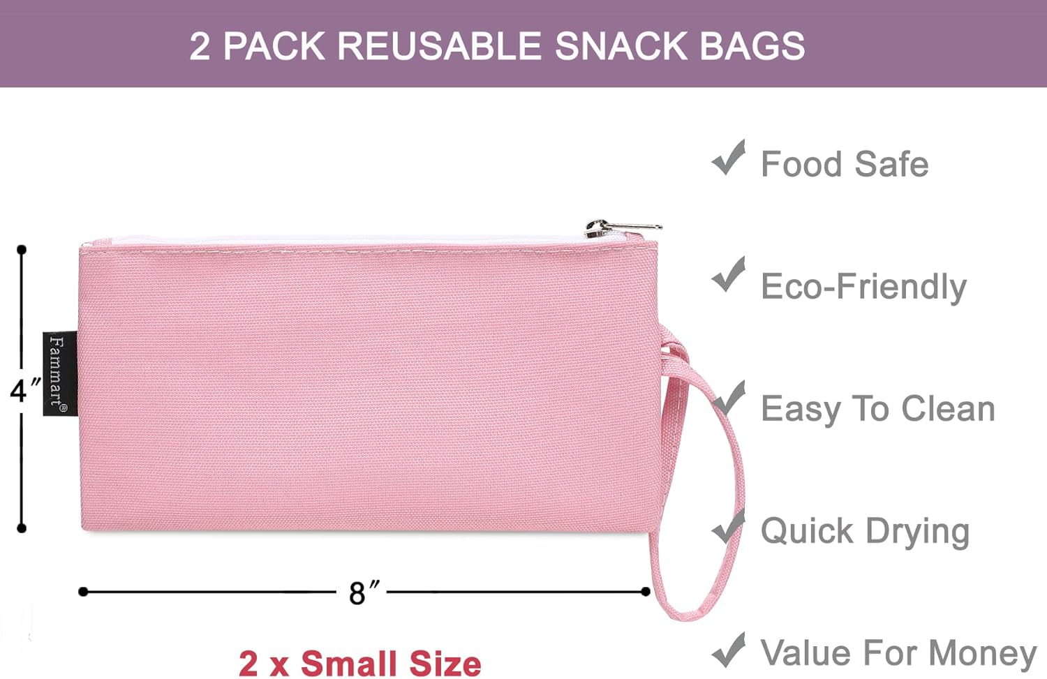 Reusable Sandwich Bag/Snack Bag for Kids & Adults, Dual Layer Lunch Bag with Handle, Washable, Food Safe, BPA Free (2-Pack, Pink)