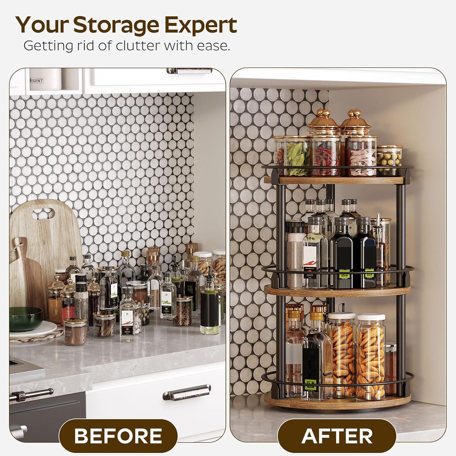 - Capacious Space: Sizing 10.2"L x 10.2"W x 18"H, this lazy susan organizer is divided into 3 layers for layered and partitioned storage to help eliminate clutter. 7.5" layer spacing design facilitates accommodating bottles of different heights
