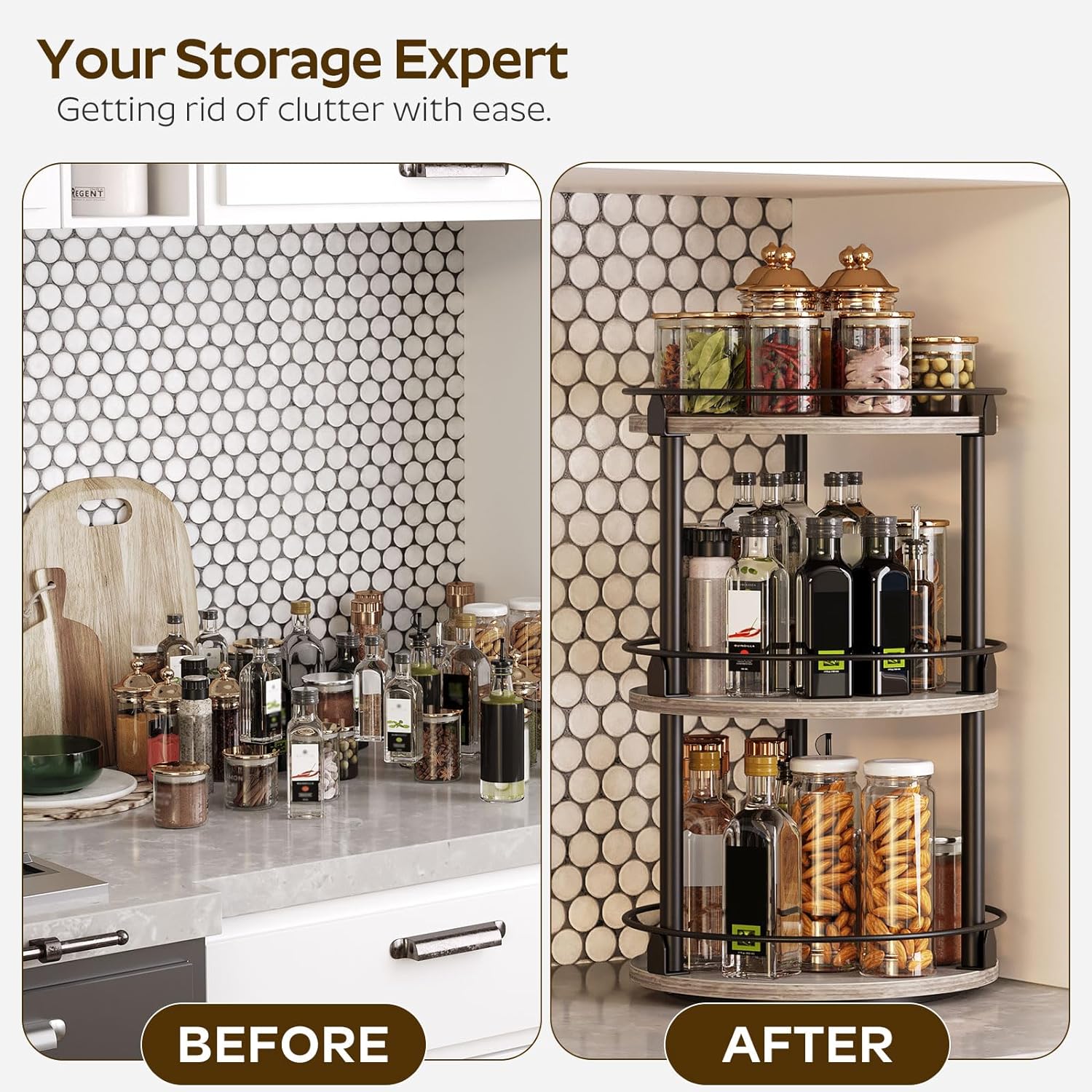 - Capacious Space: Sizing 10.2"L x 10.2"W x 18"H, this lazy susan organizer is divided into 3 layers for layered and partitioned storage to help eliminate clutter. 7.5" layer spacing design facilitates accommodating bottles of different heights