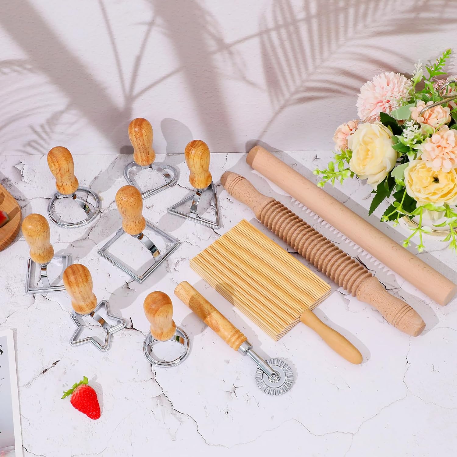Pasta Making Tool Set of 11, Ravioli Maker Cutter Stamp Set, 1 Pasta Cutter Wheel with 1 Dough Roller, 1 Wood Gnocchi Board with 1 Ravioli Rolling Pin, Pasta Maker Tools for Lasagna, Pierogi