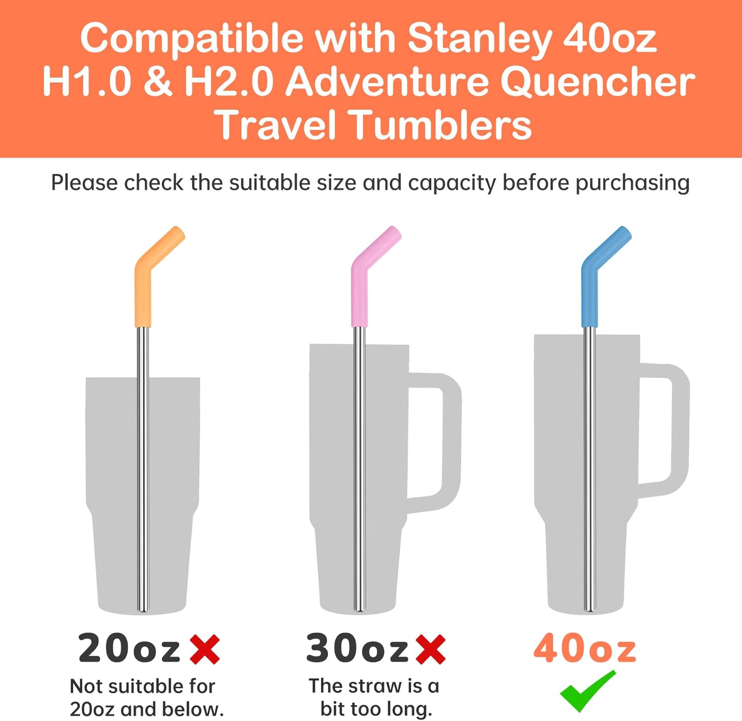 - 【Perfect Fit】Our pride, the stainless steel straw set, provides you with a perfect fitting experience. Designed specifically for 0.35-inch-wide straws, this set not only perfectly fits for the Stanley Adventure Quencher 40-ounce cup but also ensures a perfect fit for other cups. Before purchasing, be sure to measure the diameter of the straw to ensure a perfect match. The total length of the straw with silicone tip is 13 inches, providing you with longer enjoyment of your beverages.