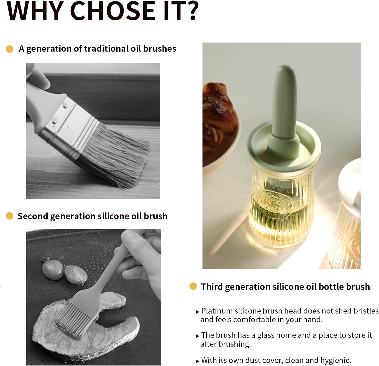 - UNIQUE 3 IN 1 DESIGN OIL DISPENSER: The brush are made of food-grade silicone. The stepped three-layer short bristle brush has no strange smell, no deformation, no hair loss, and a heat-resistant temperature of up to 250Β°C/485Β°F and can evenly distribute food. The oil dispenser with brush is made of food-grade PP material, which is durable and not easily broken.