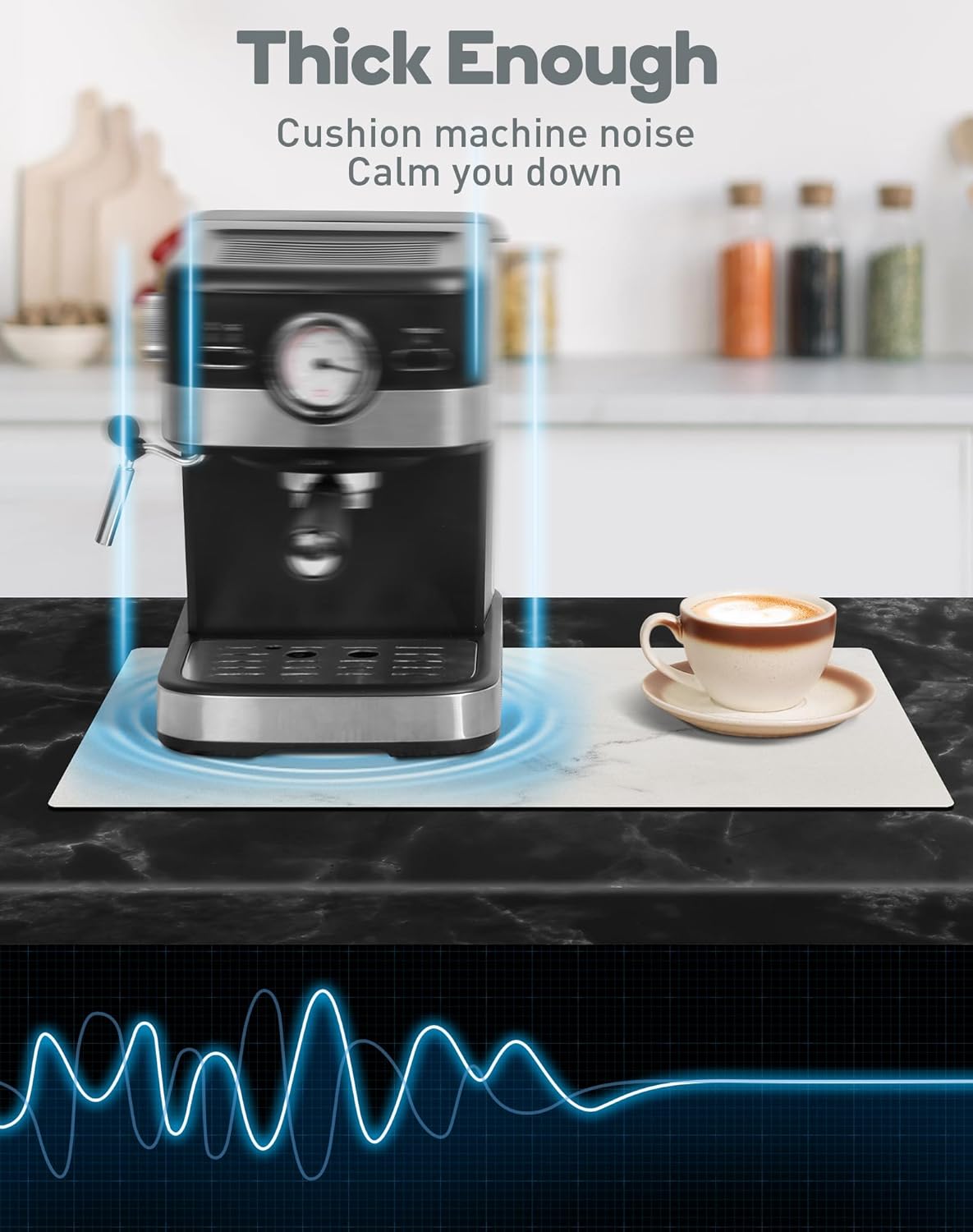 - Noise-dampening & Heat-resistant - Our coffee bar mat is 1/6" thick, which can effectively cushion coffee machine noise and reduce clinking sounds as cups touch the tabletop, ensuring you a tranquil and pleasant coffee experience. Additionally, it provides ample protection for your countertop, effectively shielding it from the heat of boiling water.