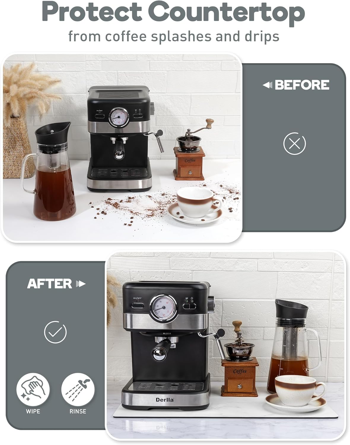 - Easy To Clean - Featuring a PU leathaire surface, this coffee mat is both stain-resistant and easy to maintain. You can simlpy wipe up the spills and grounds, or give it a quick rinse, and the mat will look as good as new. It provides excellent protection for your countertop against splashes and drips, effectively keeping it free from coffee stains.