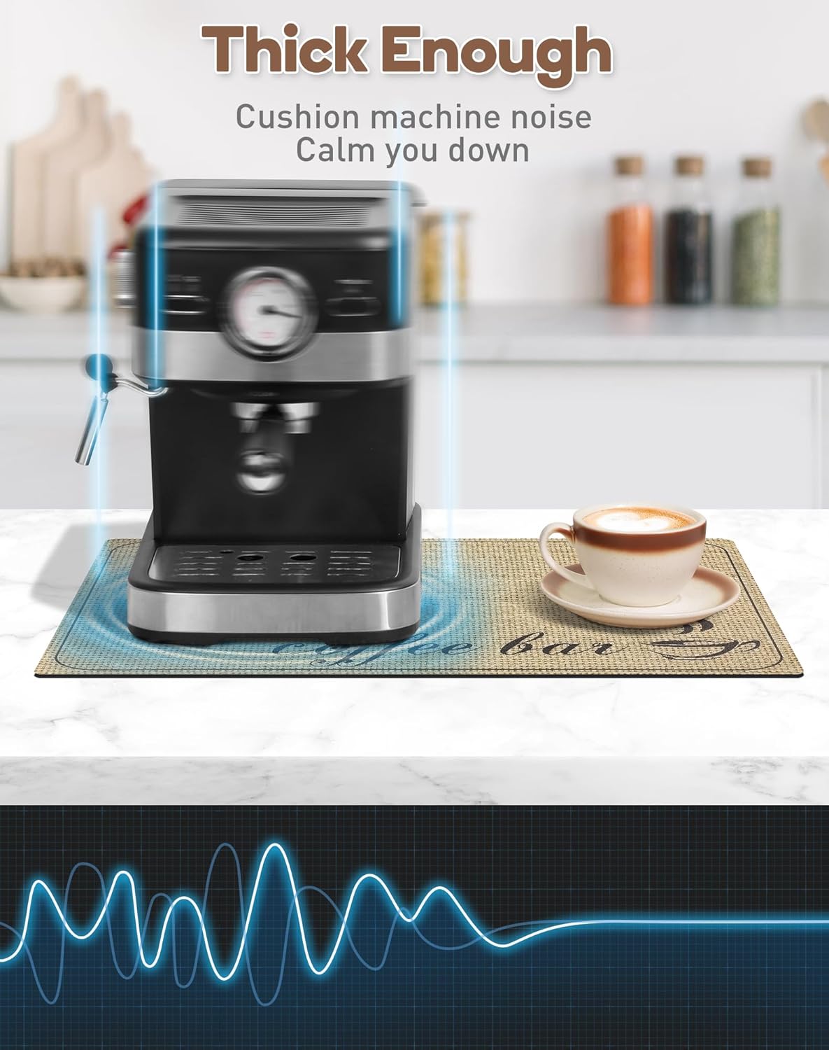 - Noise-dampening & Heat-resistant - Our coffee bar mat is 1/6" thick, which can effectively cushion coffee machine noise and reduce clinking sounds as cups touch the tabletop, ensuring you a tranquil and pleasant coffee experience. Additionally, it provides ample protection for your countertop, effectively shielding it from the heat of boiling water.