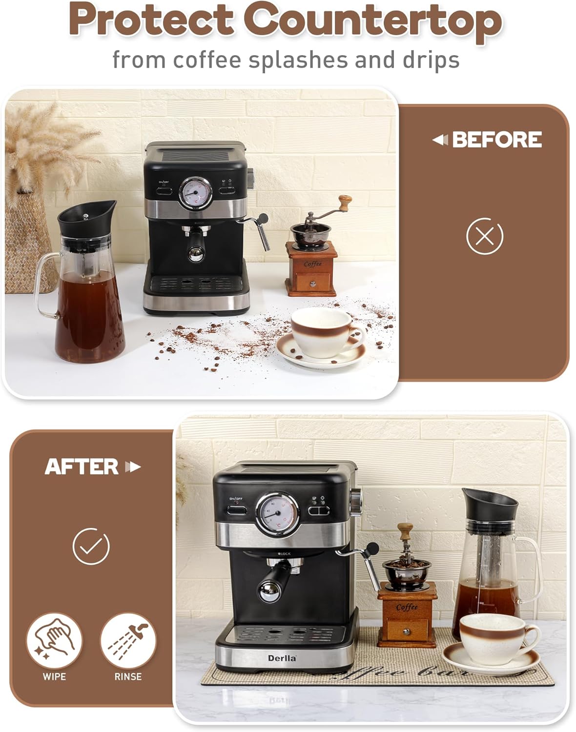 - Easy To Clean - Featuring a PU leathaire surface, this coffee mat is both stain-resistant and easy to maintain. You can simlpy wipe up the spills and grounds, or give it a quick rinse, and the mat will look as good as new. It provides excellent protection for your countertop against splashes and drips, effectively keeping it free from coffee stains.