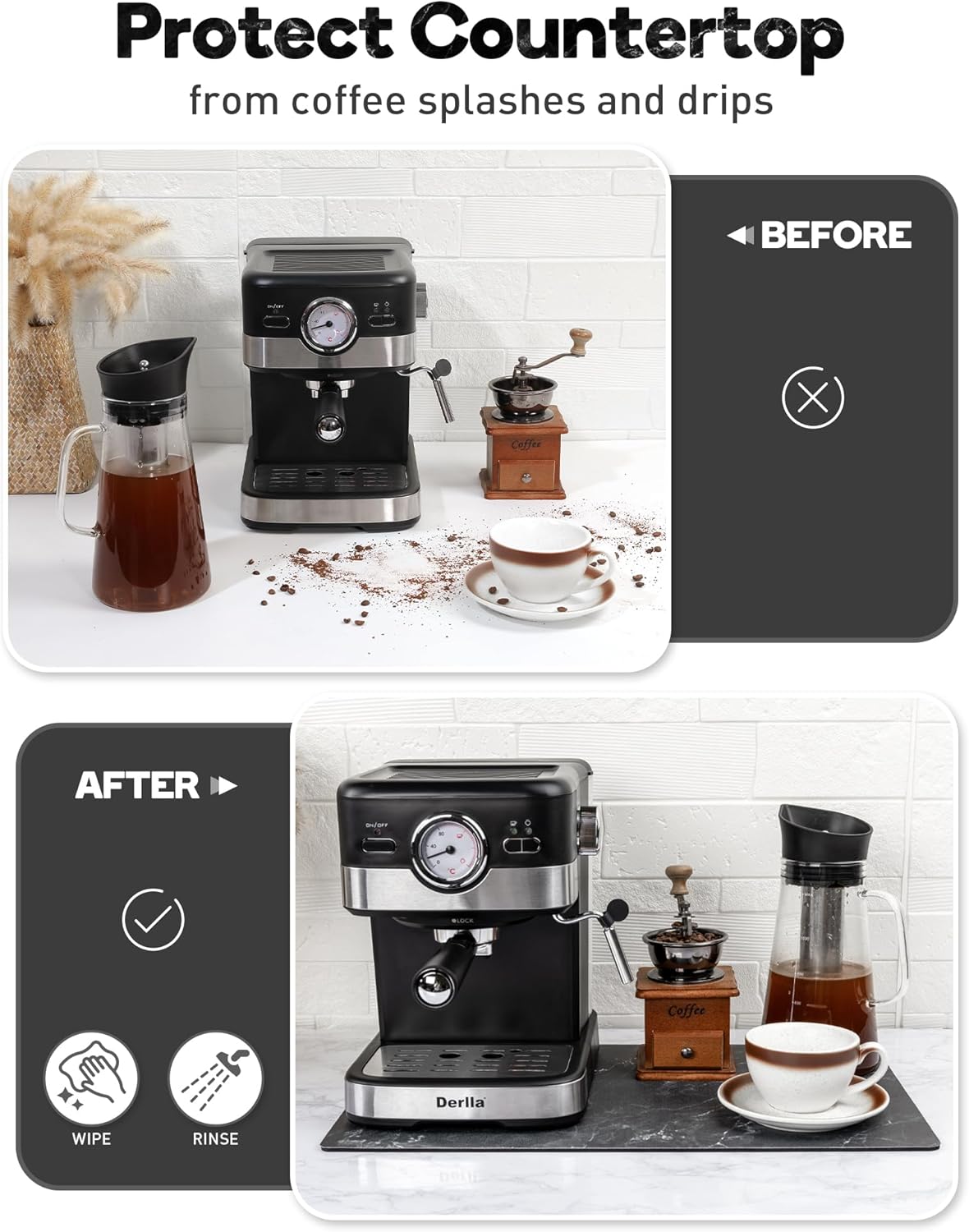 - Easy To Clean - Featuring a PU leathaire surface, this coffee mat is both stain-resistant and easy to maintain. You can simlpy wipe up the spills and grounds, or give it a quick rinse, and the mat will look as good as new. It provides excellent protection for your countertop against splashes and drips, effectively keeping it free from coffee stains.