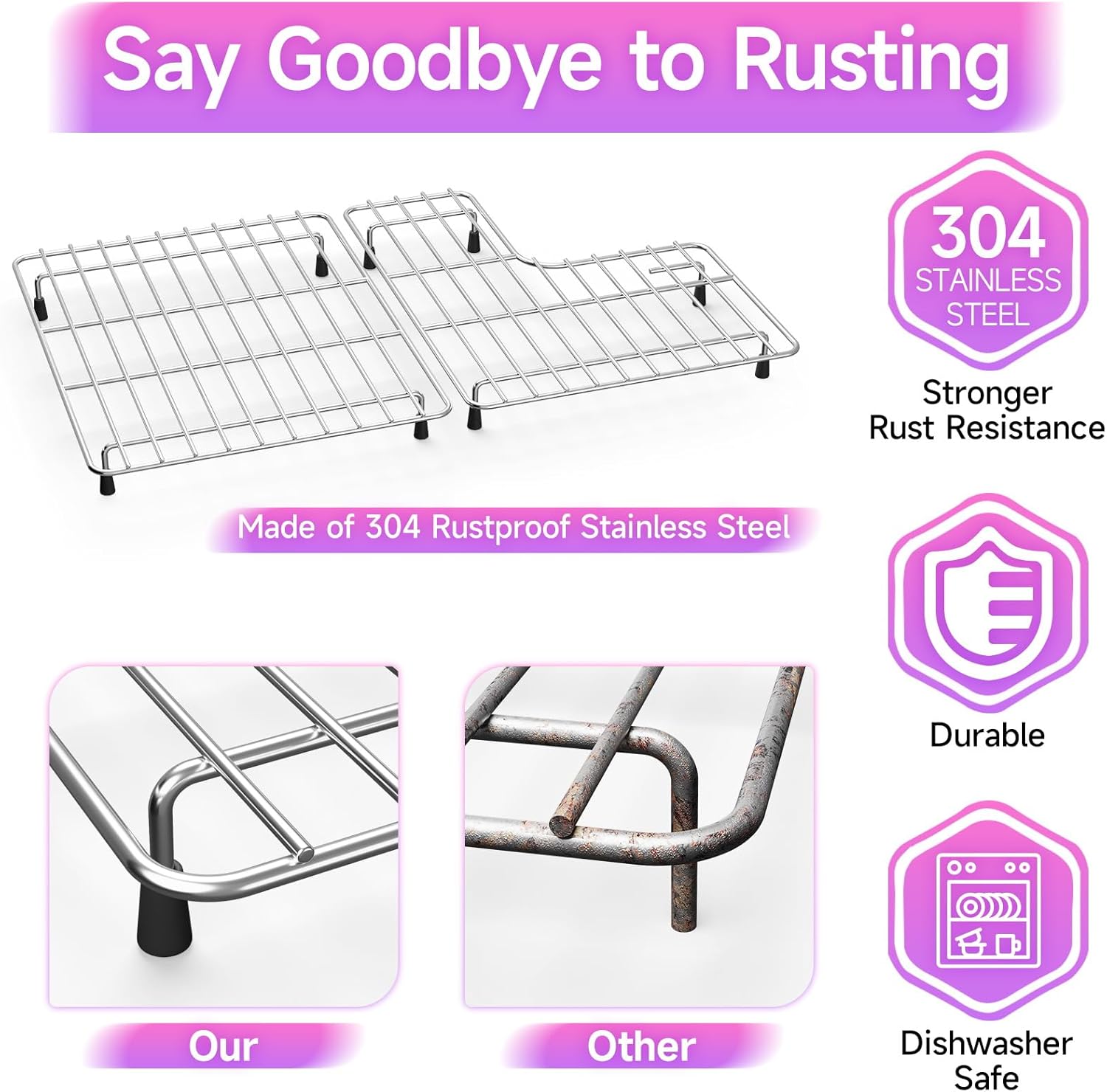 - Premium Material: We Strictly select materials, made of 304 stainless steel(not cheap 201) to ensure durability and no rust. The stainless steel surface is treated by electroplating process, and the solder joints are carefully polished by us to ensure that the detailed position is smooth and does not hurt your hands, so that you can use it easily. In addition, there are 9 rubber feet specially configured for this sink grid to effectively prevent scratching your sink