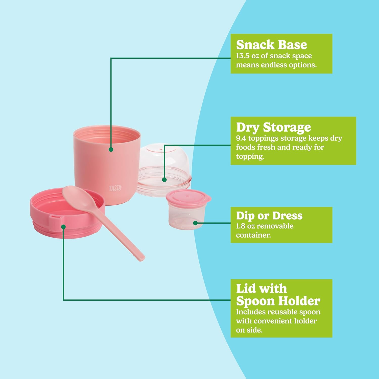 - DIVIDED COMPARTMENTS: Features a 9.4oz dry toppings storage for nuts, granola, or dried fruit, a 13.5oz base for overnight oats, yogurts, fresh fruit, and a 1.8oz removable container with lid for dips and dressings.