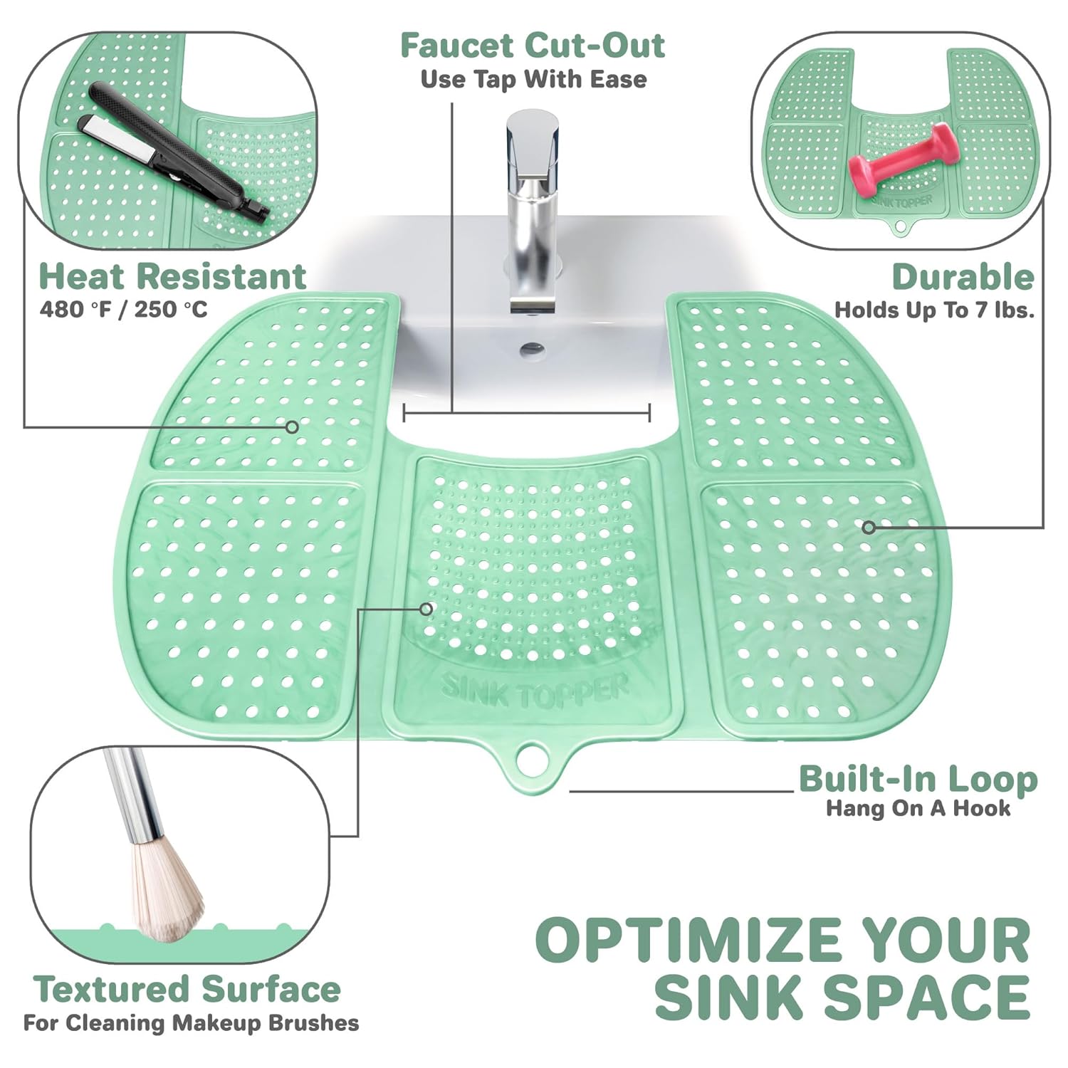 Sink Topper Bathroom Counter Cover & Storage Saver, Foldable Silicone Mat for Hot Tools, Hair Styling & Makeup, Beauty Brush Cleaning Mat, RV Camper Sink Cover & for Small Spaces (Large Green)