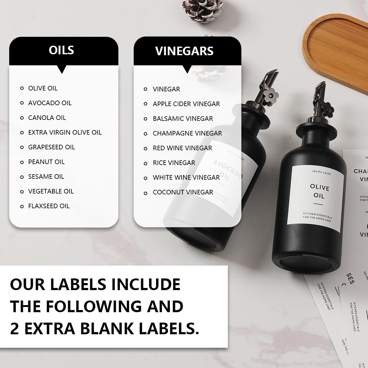 - KITCHEN OLIVE OIL DISPENSER BOTTLES – The oil and vinegar dispenser set contains 2 black 11.8oz (350ML) glass bottles, 2 black stainless steel oil spouts, 17 waterproof labels(kinds of oil and vinegar) and a bamboo tray, Ideal for safely store and dispense your olive oil and vinegar.
