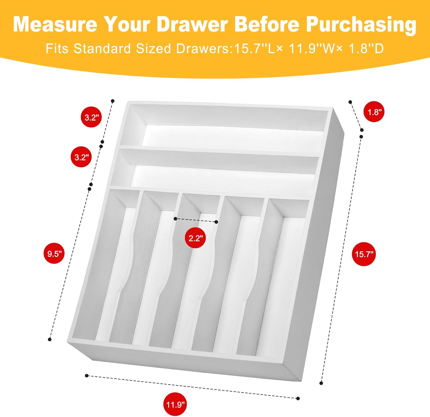 Kitchen Bamboo Silverware Organizer, Kitchen Drawer Organizer - Utensil Holder and Cutlery Tray with Grooved Drawer Dividers for Flatware 7 Slot, White