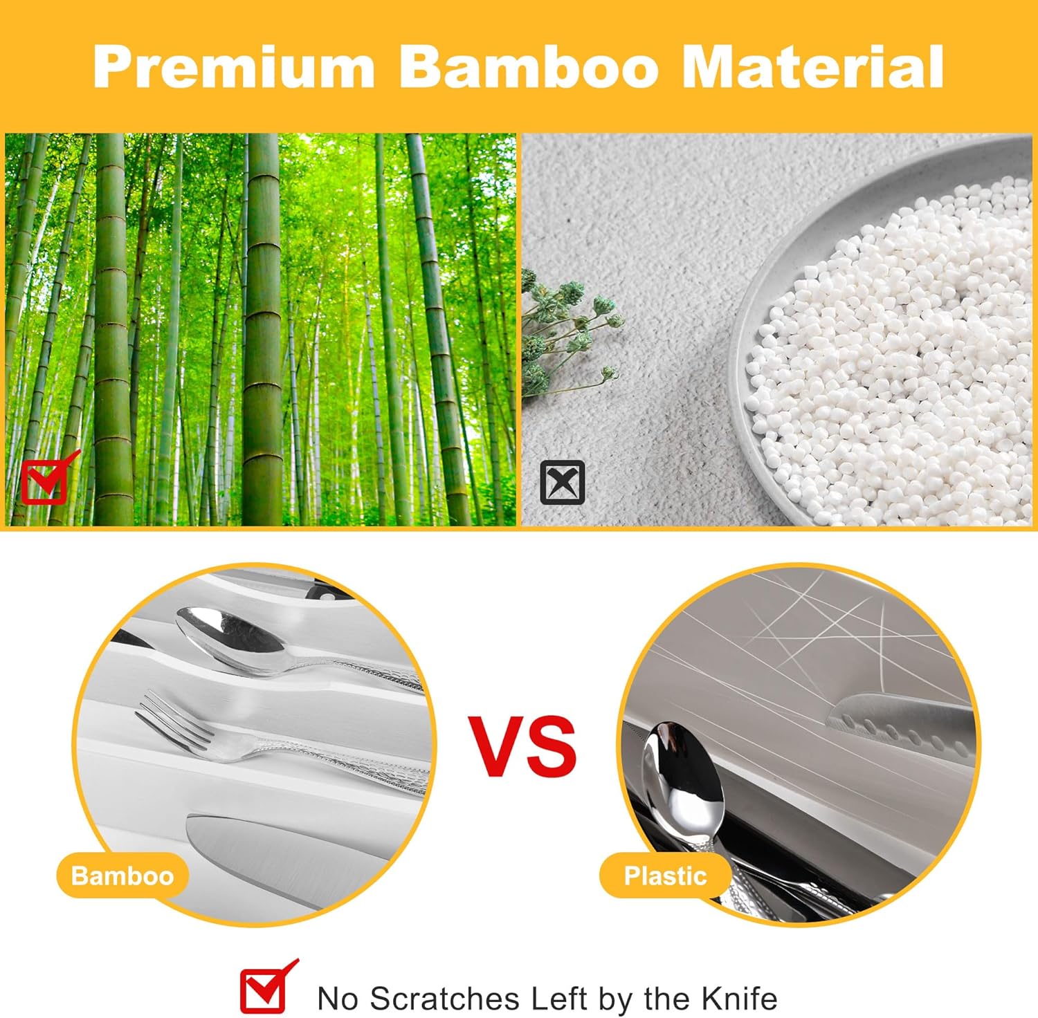 - ✅【Sturdy and Well-made】Our silverware tray for drawer is made of minimally refined natural bamboo, a renewable, sustainable source, making them a green choice, with the age of over 4 years, which makes the silverware holder durable enough for long time use. Unlike the plastic and metal drawer organizer, our flatware & utensil is water & odor resistant, the silverware organizing tray is perfect for years of use, especially in kitchens where things can get messy quickly.