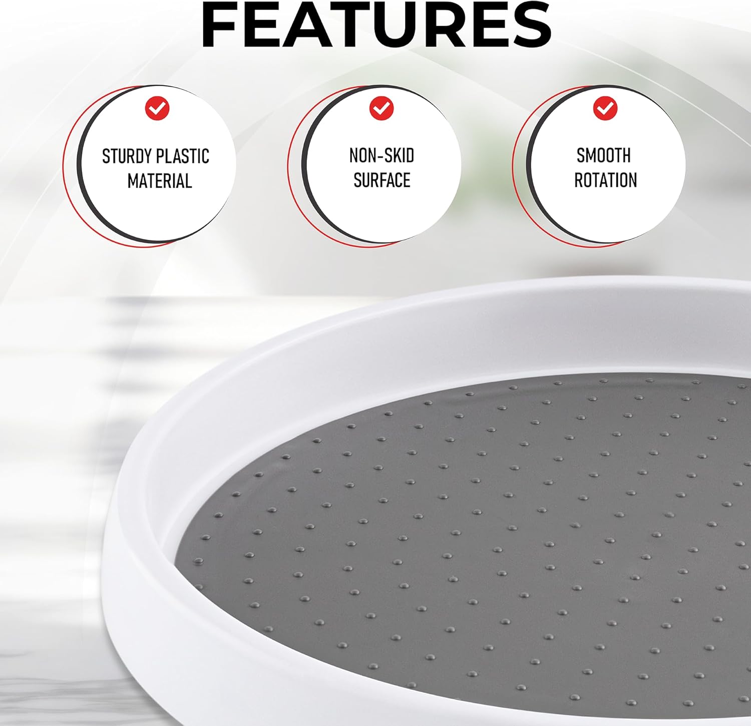 - NON-SKID SURFACE: Features a textured top that grips items firmly, reducing slippage and enhancing stability, ensuring your essentials remain secure, even as the turntable rotates