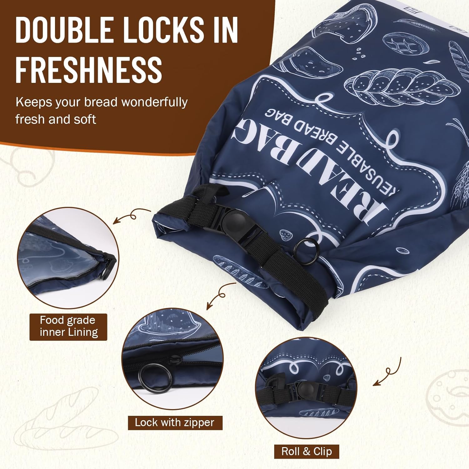 - KEEP BREAD FRESHER by DUBLE LOCK: It is a bag with the lining of Food Grade. Unlike other bags, use double lock. Use the first lock with a zipper and the second lock with a buckle to keep the bread fresher.