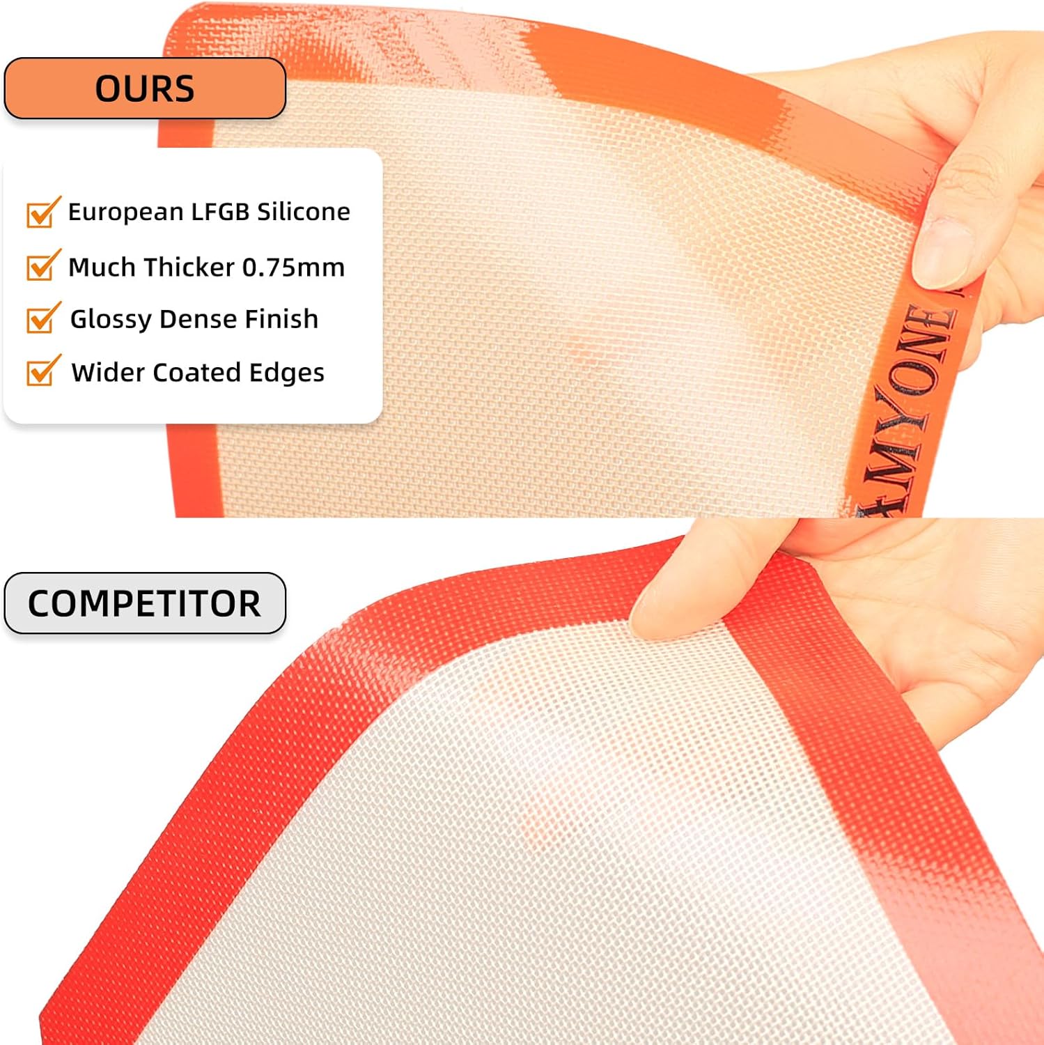 - 🧀【EXCEPTIONAL QUALITY & SAFETY】Crafted from the finest food-grade silicone and internally reinforced with fiberglass, this mat meets the highest standards of quality and safety. With a thickness of 0.75mm and with glossy dense finish as well as wider coated edges, these baking mats for 11-inch square sheets, are designed to withstand temperatures ranging from -40°F to 480°F (-40°C to 249°C), making it suitable for a wide range of baking needs.