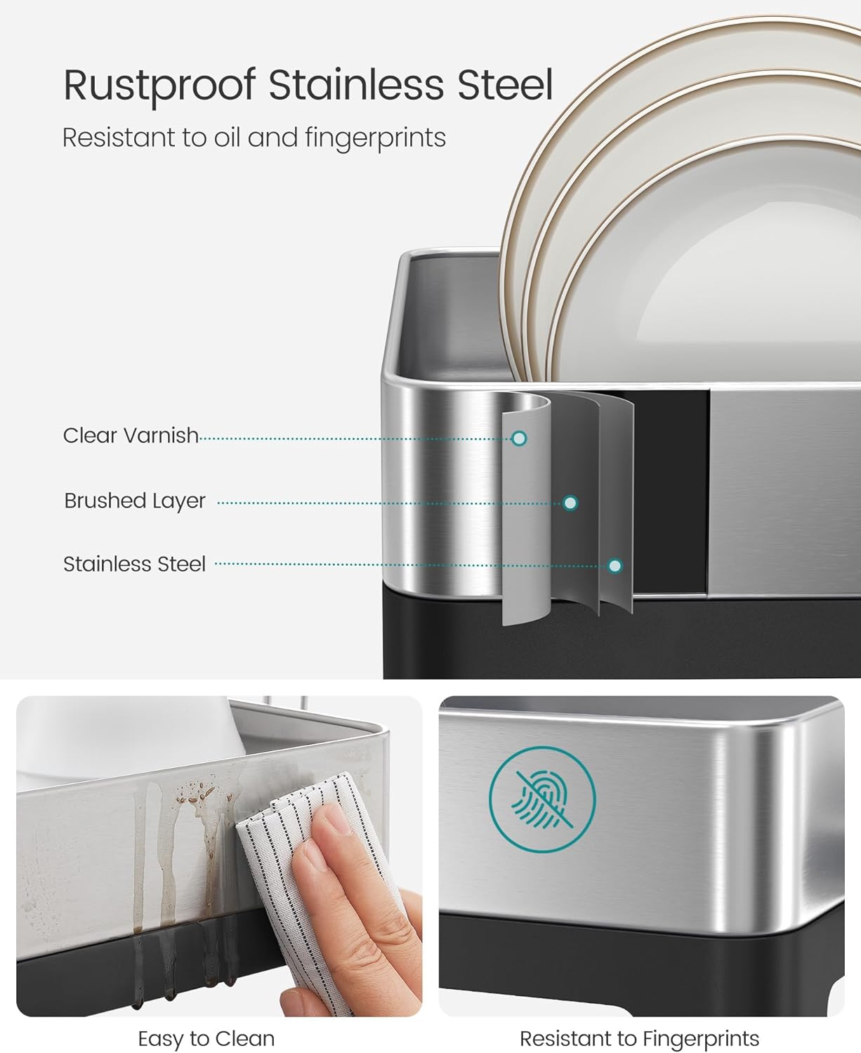 - ăPREMIUM STAINLESS STEELăCrafted from brushed stainless steel, this dish drying rack is rustproof, as well as oil and fingerprint-resistant, ensuring durability and easy cleaning
