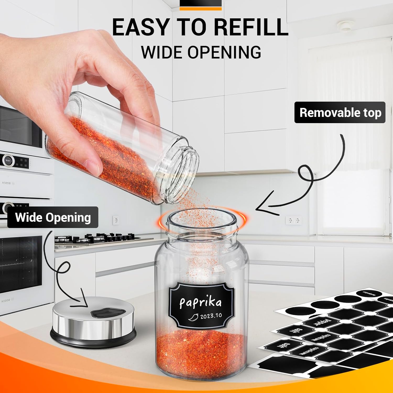 - Clear Empty Spice Containers: Our spice storage containers are crafted from high-quality thickened glass, ensuring their durability and sturdiness. Seasoning shakers protects the spices from light, moisture and air, keeping them fresh and flavourful for longer.The transparency of the spices shakers enhances the kitchen's aesthetic and allows you to quickly identify and locate specific spices, ensures that you can clearly see the spices in the bottle, so that you can refill it in time.